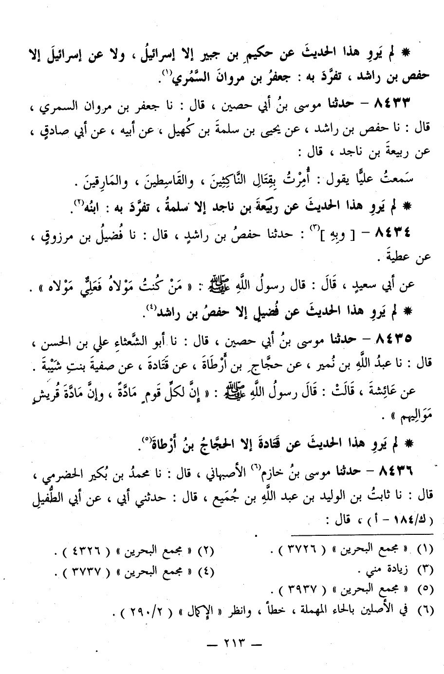 8433 - حَدَّثَنَا مُوسَى بْنُ أَبِي حُصَيْنٍ قَالَ: نا جَعْفَرُ بْنُ مَرْوَانَ السَّمُرِيُّ قَالَ: نا حَفْصُ بْنُ رَاشِدٍ، عَنْ يَحْيَى بْنِ سَلَمَةَ بْنِ كُهَيْلٍ، عَنْ أَبِيهِ، عَنْ أَبِي صَادِقٍ، عَنْ رَبِيعَةَ بْنِ نَاجِدٍ قَالَ: سَمِعْتُ عَلِيًّا، يَقُولُ: «§أُمِرْتُ بِقِتَالِ النَّاكِثِينَ، وَالْقَاسِطِينَ، وَالْمَارِقِينَ»