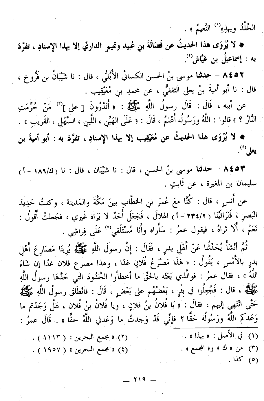 8453 - حَدَّثَنَا مُوسَى بْنُ الْحَسَنِ قَالَ: نا شَيْبَانُ قَالَ: نا سُلَيْمَانُ بْنُ الْمُغِيرَةِ، عَنْ ثَابِتٍ، عَنْ أَنَسٍ قَالَ: كُنَّا مَعَ عُمَرَ بْنِ الْخَطَّابِ، بَيْنَ مَكَّةَ وَالْمَدِينَةِ، وَكُنْتُ حَدِيدَ الْبَصَرِ، فَتَرَاءَيْنَا الْهِلَالَ، فَجَعَلَ أَحَدٌ لَا يَرَاهُ غَيْرِي، فَجَعَلْتُ أَقُولُ: نَعَمْ، أَلَا تَرَاهُ، فَيَقُولُ عُمَرُ: سَأَرَاهُ وَأَنَا مُسْتَلْقٍ عَلَى فِرَاشِي، ثُمَّ أَنْشَأَ يُحَدِّثُنَا عَنْ أَهْلِ بَدْرٍ، فَقَالَ: إِنَّ رَسُولَ اللَّهِ صَلَّى اللهُ عَلَيْهِ وَسَلَّمَ يُرِينَا مَصَارِعَ أَهْلِ بَدْرٍ بِالْأَمْسِ، يَقُولُ: «§هَذَا مَصْرَعُ فُلَانٍ غَدًا، وَهَذَا مَصْرَعُ فُلَانٍ غَدًا إِنْ شَاءَ اللَّهُ» ، فَقَالَ عُمَرُ: فَوَالَّذِي بَعَثَهُ بِالْحَقِّ مَا أَخْطَأُوا الْحُدُودَ الَّتِي حَدَّهَا رَسُولُ اللَّهِ صَلَّى اللهُ عَلَيْهِ وَسَلَّمَ قَالَ: فَجُعِلُوا فِي بِئْرٍ بَعْضُهُمْ عَلَى بَعْضٍ قَالَ: فَانْطَلَقَ رَسُولُ اللَّهِ صَلَّى اللهُ عَلَيْهِ وَسَلَّمَ حَتَّى انْتَهَى إِلَيْهِمْ، فَقَالَ: «يَا فُلَانُ بْنُ فُلَانٍ، وَيَا فُلَانَ بْنَ فُلَانٍ، هَلْ وَجَدْتُمْ مَا وَعَدَكُمُ اللَّهُ وَرَسُولُهُ حَقًّا؟، فَإِنِّي قَدْ وَجَدْتُ مَا وَعَدَنِي اللَّهُ حَقًّا» ، قَالَ عُمَرُ: -[220]- يَا رَسُولَ اللَّهِ، كَيْفَ تُكَلِّمُ أَجْسَادًا لَا أَرْوَاحَ فِيهَا؟ قَالَ: «مَا أَنْتُمْ بِأَسْمَعَ لِمَا أَقُولُ مِنْهُمْ، غَيْرَ أَنَّهُمْ لَا يَسْتَطِيعُونَ أَنْ يَرُدُّوا شَيْئًا» ، لَا يُرْوَى هَذَا الْحَدِيثُ عَنْ عُمَرَ إِلَّا بِهَذَا الْإِسْنَادِ، تَفَرَّدَ بِهِ: سُلَيْمَانُ بْنُ الْمُغِيرَةِ