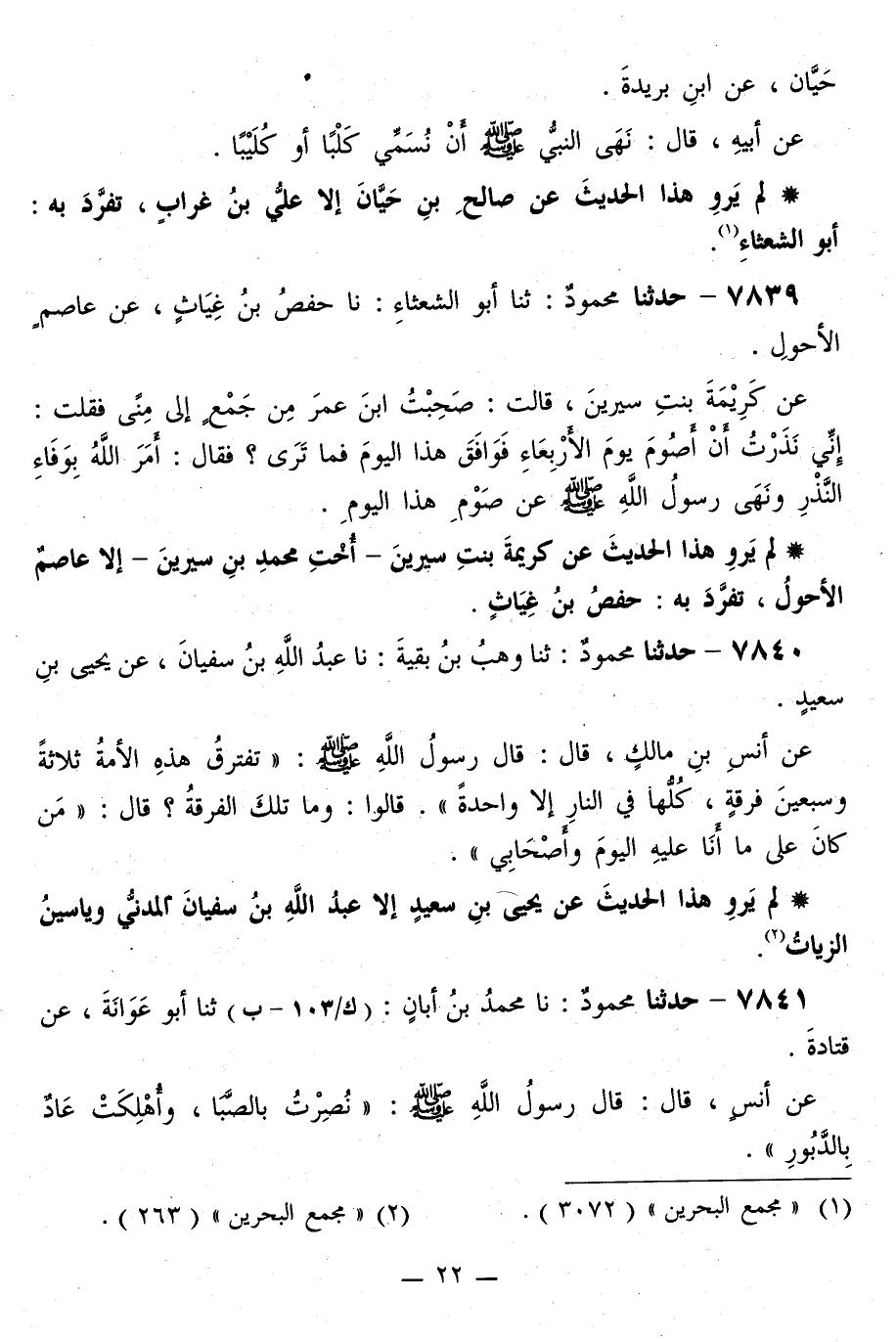 7840 - حَدَّثَنَا مَحْمُودٌ، ثَنَا وَهْبُ بْنُ بَقِيَّةَ، نا عَبْدُ اللَّهِ بْنُ سُفْيَانَ، عَنْ يَحْيَى بْنِ سَعِيدٍ، عَنْ أَنَسِ بْنِ مَالِكٍ قَالَ: قَالَ رَسُولُ اللَّهِ صَلَّى اللهُ عَلَيْهِ وَسَلَّمَ: «§تَفْتَرِقُ هَذِهِ الْأُمَّةُ ثَلَاثَةً وَسَبْعِينَ فِرْقَةً كُلُّهَا فِي النَّارِ إِلَّا وَاحِدَةً» . قَالُوا: وَمَا تِلْكَ الْفِرْقَةُ؟ قَالَ: «مَنْ كَانَ عَلَى مَا أَنَا عَلَيْهِ الْيَوْمَ وَأَصْحَابِي»
