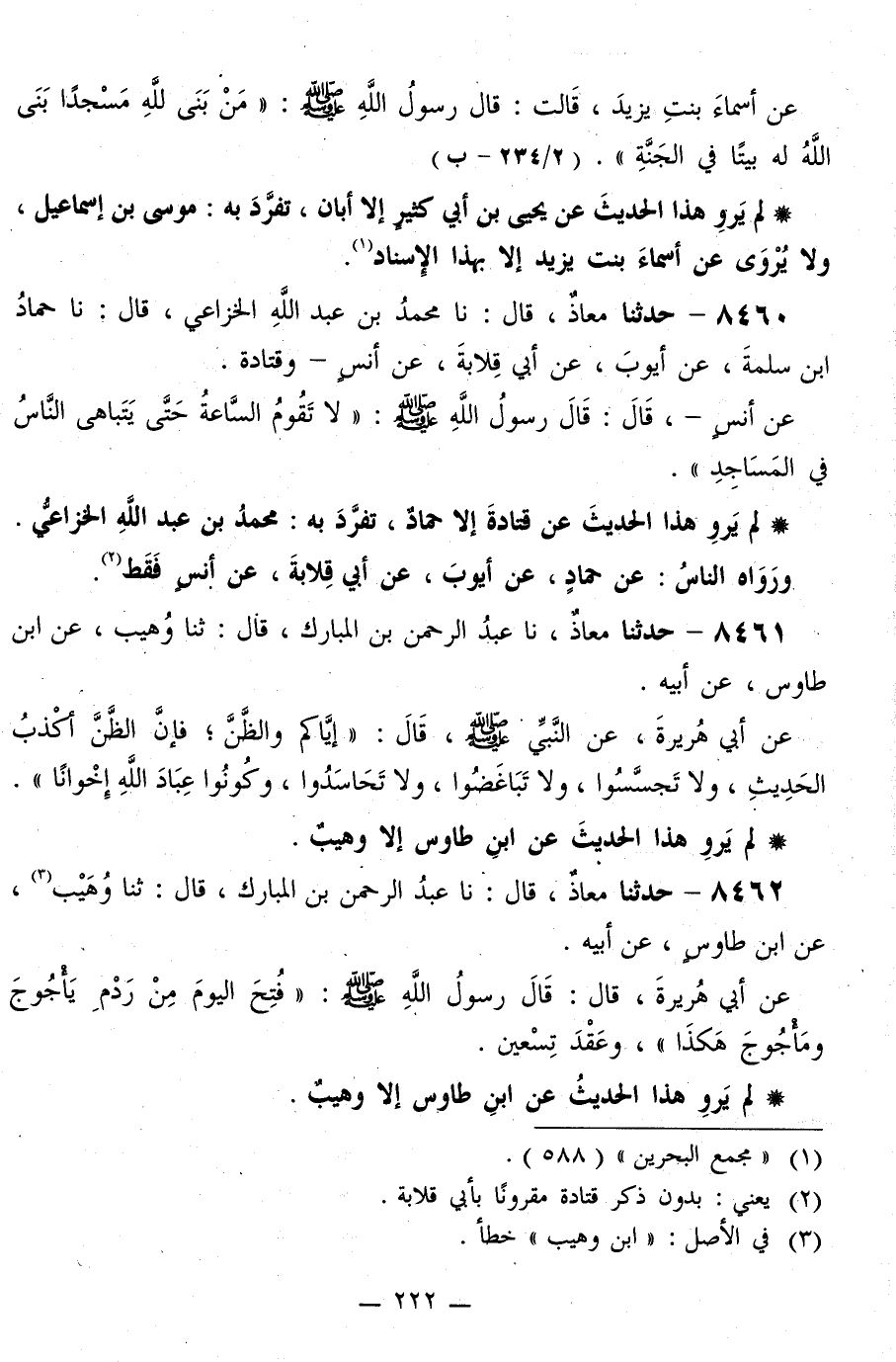8460 - حَدَّثَنَا مُعَاذٌ قَالَ: نا مُحَمَّدُ بْنُ عَبْدِ اللَّهِ الْخُزَاعِيُّ قَالَ: نا حَمَّادُ بْنُ سَلَمَةَ، عَنْ أَيُّوبَ، عَنْ أَبِي قِلَابَةَ، عَنْ أَنَسٍ، وَقَتَادَةَ، عَنْ أَنَسٍ قَالَ: قَالَ رَسُولُ اللَّهِ صَلَّى اللهُ عَلَيْهِ وَسَلَّمَ: «§لَا تَقُومُ السَّاعَةُ حَتَّى يَتَبَاهَى النَّاسُ فِي الْمَسَاجِدِ»