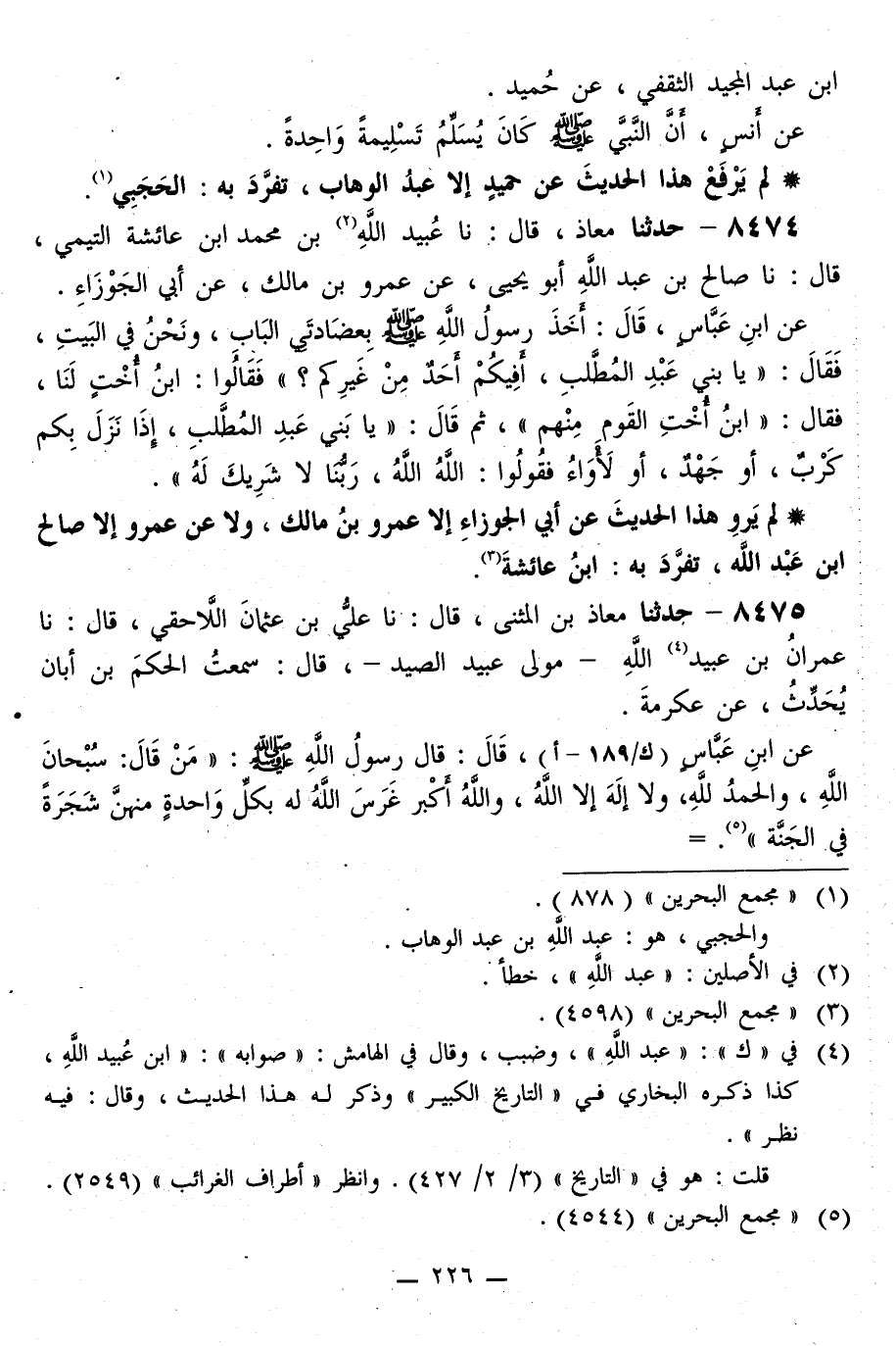 8475 - حَدَّثَنَا مُعَاذُ بْنُ الْمُثَنَّى قَالَ: نا عَلِيُّ بْنُ عُثْمَانَ اللَّاحِقِيُّ قَالَ: نا عِمْرَانُ بْنُ عُبَيْدِ اللَّهِ، مَوْلَى عُبَيْدِ الصَّيْدِ قَالَ: سَمِعْتُ الْحَكَمَ بْنَ أَبَانَ، يُحَدِّثُ، عَنْ عِكْرِمَةَ، عَنِ ابْنِ عَبَّاسٍ قَالَ: قَالَ رَسُولُ اللَّهِ صَلَّى اللهُ عَلَيْهِ وَسَلَّمَ: «§مَنْ قَالَ: سُبْحَانَ اللَّهِ، وَالْحَمْدُ لِلَّهِ، وَلَا إِلَهَ إِلَّا اللَّهُ، وَاللَّهُ أَكْبَرُ غَرَسَ اللَّهُ لَهُ بِكُلِّ وَاحِدَةٍ مِنْهُنَّ شَجَرَةً فِي الْجَنَّةِ»