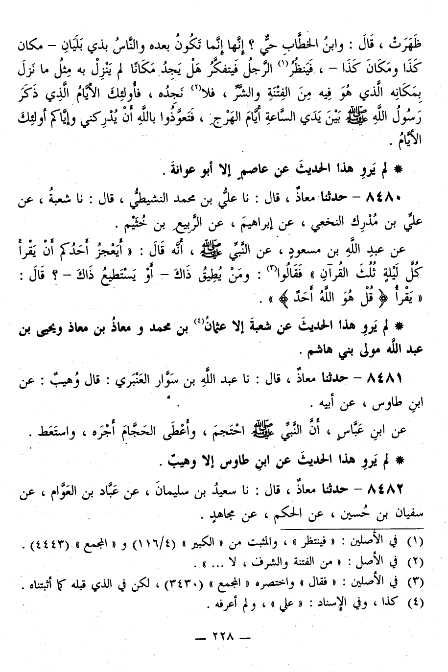 8480 - حَدَّثَنَا مُعَاذٌ قَالَ: نا عَلِيُّ بْنُ مُحَمَّدٍ النَّشِيطُّي قَالَ: نا شُعْبَةُ، عَنْ عَلِيِّ بْنِ مُدْرِكٍ النَّخَعِيِّ، عَنْ إِبْرَاهِيمَ، عَنِ الرَّبِيعِ بْنِ خُثَيْمٍ، عَنْ عَبْدِ اللَّهِ بْنِ مَسْعُودٍ، عَنِ النَّبِيِّ صَلَّى اللهُ عَلَيْهِ وَسَلَّمَ، أَنَّهُ قَالَ: «§أَيَعْجِزُ أَحَدُكُمْ أَنْ يَقْرَأَ كُلَّ لَيْلَةٍ ثُلُثَ الْقُرْآنِ» ، فَقَالُوا: وَمَنْ يُطِيقُ ذَاكَ أَوْ يَسْتَطِيعُ ذَاكَ؟ قَالَ: «يَقْرَأُ قُلْ هُوَ اللَّهُ أَحَدٌ»
