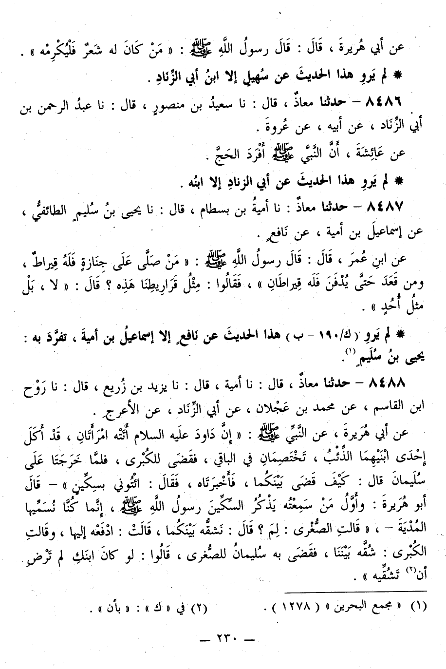 8488 - حَدَّثَنَا مُعَاذٌ قَالَ: نا أُمَيَّةُ قَالَ: نا يَزِيدُ بْنُ زُرَيْعٍ قَالَ: نا رَوْحُ بْنُ الْقَاسِمِ، عَنْ مُحَمَّدِ بْنِ عَجْلَانَ، عَنْ أَبِي الزِّنَادِ، عَنِ الْأَعْرَجِ، عَنْ أَبِي هُرَيْرَةَ، عَنِ النَّبِيِّ صَلَّى اللهُ عَلَيْهِ وَسَلَّمَ: «إِنَّ §دَاوُدَ عَلَيْهِ السَّلَامُ أَتَتْهُ امْرَأَتَانِ، قَدْ أَكَلَ إِحْدَى ابْنَيْهِمَا الذِّئْبُ، تَخْتَصِمَانِ فِي الْبَاقِي، فَقَضَى لِلْكُبْرَى، فَلَمَّا خَرَجَتَا عَلَى سُلَيْمَانَ قَالَ: كَيْفَ قَضَى بَيْنَكُمَا، فَأَخْبَرَتَاهُ، فَقَالَ: ائْتُونِي بِسِكِّينٍ، قَالَ أَبُو هُرَيْرَةَ: وَأَوَّلُ مَا سَمِعَتْهُ يَذْكُرُ السِّكِّينَ رَسُولُ اللَّهِ صَلَّى اللهُ عَلَيْهِ وَسَلَّمَ، إِنَّمَا كُنَّا نُسَمِّيهَا الْمُدْيَةَ، قَالَتِ الصُّغْرَى: لِمَ؟ قَالَ: نَشُقُّهُ بَيْنَكُمَا، قَالَتْ: ادْفَعْهُ إِلَيْهَا، وَقَالَتِ الْكُبْرَى: شُقَّهُ بَيْنَنَا، فَقَضَى بِهِ سُلَيْمَانُ لِلصُّغْرَى، قَالُوا: لَوْ كَانَ ابْنَكِ لَمْ تَرْضِي أَنْ تَشُقِّيهِ» -[231]- لَمْ يَرْوِ هَذَا الْحَدِيثَ عَنْ رَوْحٍ إِلَّا يَزِيدُ بْنُ زُرَيْعٍ، تَفَرَّدَ بِهِ: أُمَيَّةُ "