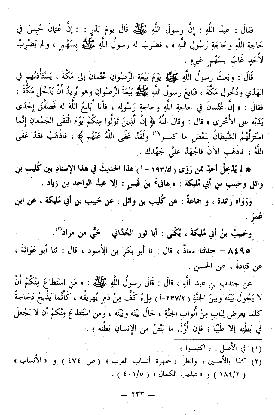 8495 - حَدَّثَنَا مُعَاذٌ قَالَ: نا أَبُو بَكْرِ بْنُ الْأَسْوَدِ قَالَ: ثَنَا أَبُو عَوَانَةَ، عَنْ قَتَادَةَ، عَنِ الْحَسَنِ، عَنْ جُنْدُبِ بْنِ عَبْدِ اللَّهِ قَالَ: قَالَ رَسُولُ اللَّهِ صَلَّى اللهُ عَلَيْهِ وَسَلَّمَ: «§مَنِ اسْتَطَاعَ مِنْكُمْ أَنْ لَا يَحُولَ بَيْنَهُ وَبَيْنَ الْجَنَّةِ مِلْءُ كَفٍّ مِنْ دَمٍ يُهْرِيقُهُ، كَأَنَّمَا يَذْبَحُ دَجَاجَةً كُلَّمَا يَعْرِضُ لِبَابٍ مِنْ أَبْوَابِ الْجَنَّةِ، حَالَ بَيْنَهُ وَبَيْنَهُ، وَمَنِ اسْتَطَاعَ مِنْكُمْ أَنْ لَا يَجْعَلَ فِي بَطْنِهِ إِلَّا طَيِّبًا، فَإِنَّ أَوَّلَ مَا يَنْتِنُ مِنَ الْإِنْسَانِ بَطْنُهُ» -[234]- لَمْ يَرْوِ هَذَا الْحَدِيثَ عَنْ قَتَادَةَ إِلَّا أَبُو عَوَانَةَ، وَالْحَجَّاجُ بْنُ الْحَجَّاجِ "