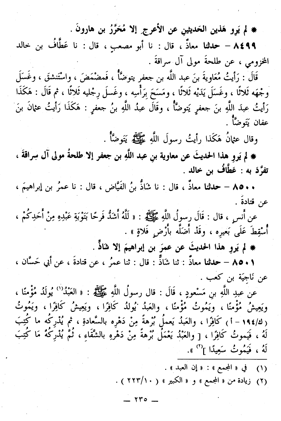 8501 - حَدَّثَنَا مُعَاذٌ، ثَنَا شَاذُّ قَالَ: ثَنَا عُمَرُ، عَنْ قَتَادَةَ، عَنْ أَبِي حَسَّانٍ، عَنْ نَاجِيَةَ بْنِ كَعْبٍ، عَنْ عَبْدِ اللَّهِ بْنِ مَسْعُودٍ قَالَ: قَالَ رَسُولُ اللَّهِ صَلَّى اللهُ عَلَيْهِ وَسَلَّمَ: «§الْعَبْدُ يُولَدُ مُؤْمِنًا، وَيَعِيشُ مُؤْمِنًا، وَيَمُوتُ مُؤْمِنًا، وَالْعَبْدُ يُولَدُ كَافِرٌ، وَيَعِيشُ كَافِرًا، وَيَمُوتُ كَافِرًا، وَالْعَبْدُ يَعْمَلُ بُرْهَةً مِنْ دَهْرِهِ بِالسَّعَادَةِ، ثُمَّ يُدْرِكُهُ مَا كُتِبَ لَهُ، فَيَمُوتُ كَافِرًا، وَالْعَبْدُ يَعْمَلُ بُرْهَةً مِنْ دَهْرِهِ بِالشَّقَاءِ، ثُمَّ يُدْرِكُهُ مَا كُتِبَ لَهُ، فَيَمُوتُ سَعِيدًا» -[236]- لَمْ يَرْوِ هَذَا الْحَدِيثَ عَنْ قَتَادَةَ إِلَّا عُمَرُ بْنُ إِبْرَاهِيمَ، تَفَرَّدَ بِهِ: شَاذُّ "