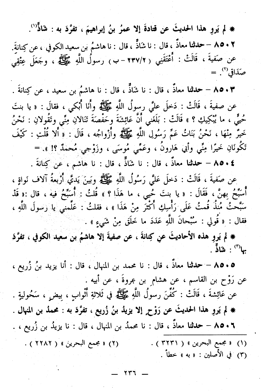 8503 - حَدَّثَنَا مُعَاذٌ قَالَ: نا شَاذُّ قَالَ: نَا هَاشِمُ بْنُ سَعِيدٍ، عَنْ كِنَانَةَ، عَنْ صَفِيَّةَ، قَالَتْ: دَخَلَ عَلَيَّ رَسُولُ اللَّهِ صَلَّى اللهُ عَلَيْهِ وَسَلَّمَ وَأَنَا أَبْكِي، فَقَالَ: «يَا بِنْتَ حُيَيٍّ، مَا يُبْكِيكِ؟» ، قَالَتْ: بَلَغَنِي أَنَّ عَائِشَةَ، وَحَفْصَةَ تَنَالِانِ مِنِّي وَتَقُولَانِ: نَحْنُ خَيْرٌ مِنْهَا، نَحْنُ بَنَاتُ عَمِّ رَسُولِ اللَّهِ صَلَّى اللهُ عَلَيْهِ وَسَلَّمَ وَأَزْوَاجُهُ قَالَ: «§أَلَا قُلْتُ: كَيْفَ تَكُونَانِ خَيْرًا مِنِّي وَأَبِي هَارُونُ، وَعَمِّي مُوسَى، وَزَوْجِي مُحَمَّدٌ؟»