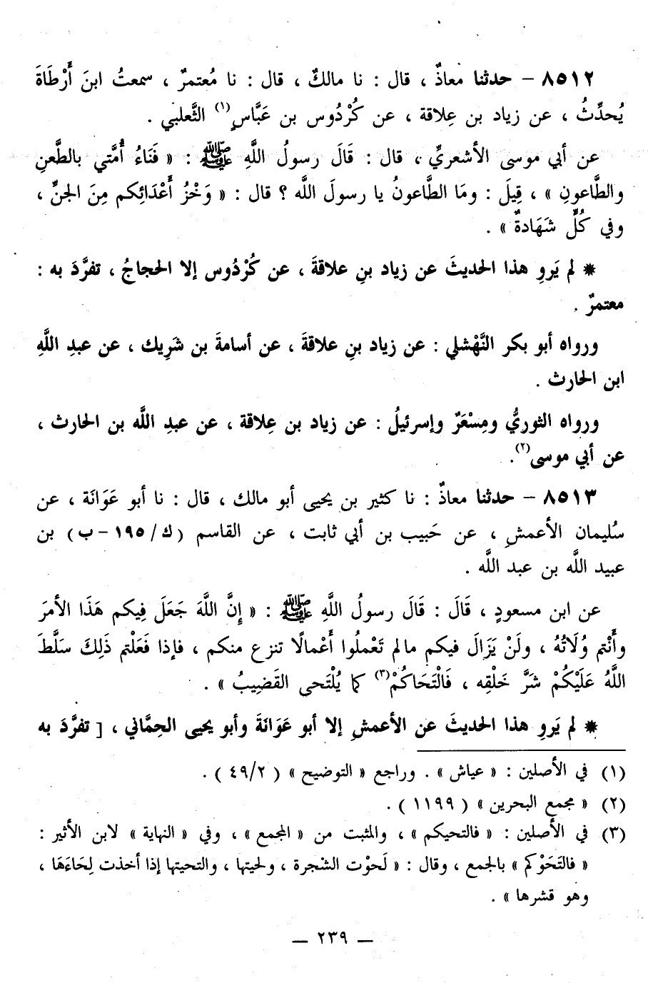 8512 - حَدَّثَنَا مُعَاذٌ قَالَ: نا مَالِكٌ قَالَ: نا مُعْتَمِرٌ، سَمِعْتُ ابْنَ أَرْطَأَةَ، يُحَدِّثُ، عَنْ زِيَادِ بْنِ عِلَاقَةَ، عَنْ كُرْدُوسِ بْنِ عَبَّاسٍ الثَّعْلَبِيِّ، عَنْ أَبِي مُوسَى الْأَشْعَرِيِّ قَالَ: قَالَ رَسُولُ اللَّهِ صَلَّى اللهُ عَلَيْهِ وَسَلَّمَ: «§فَنَاءُ أُمَّتِي بِالطَّعْنِ وَالطَّاعُونِ» ، قِيلَ: وَمَا الطَّاعُونُ يَا رَسُولَ اللَّهِ؟ قَالَ: «وَخْزُ أَعْدَائِكُمْ مِنَ الْجِنِّ، وَفِي كُلٍّ شَهَادَةٌ»