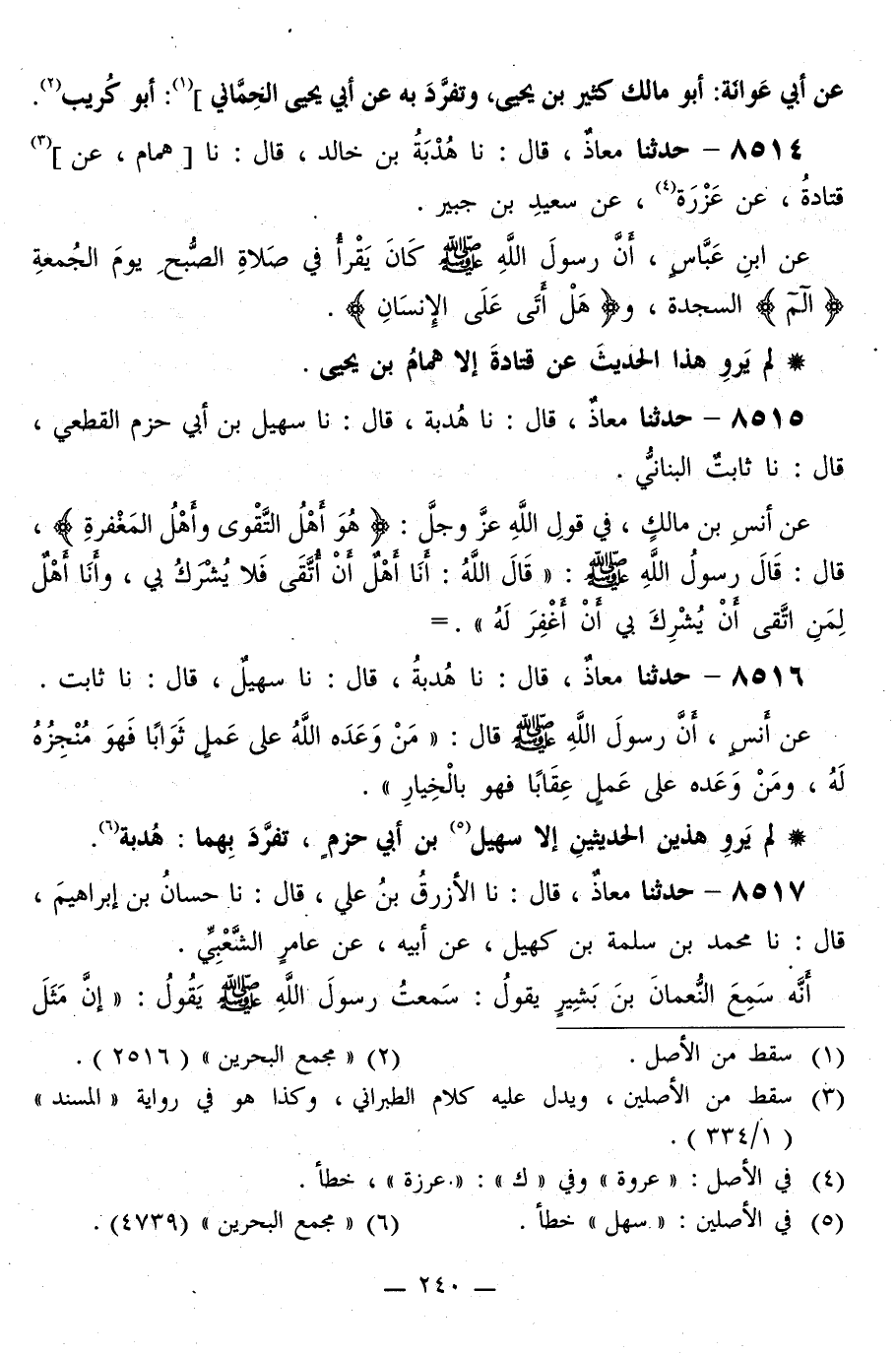 8514 - حَدَّثَنَا مُعَاذٌ قَالَ: نا هُدْبَةُ بْنُ خَالِدٍ قَالَ: نا هَمَّامٌ، عَنْ قَتَادَةَ، عَنْ عَزْرَةَ، عَنْ سَعِيدِ بْنِ جُبَيْرٍ، عَنِ ابْنِ عَبَّاسٍ، «أَنَّ رَسُولَ اللَّهِ صَلَّى اللهُ عَلَيْهِ وَسَلَّمَ كَانَ §يَقْرَأُ فِي صَلَاةِ الصُّبْحِ يَوْمَ الْجُمُعَةِ الم السَّجْدَةَ، وَهَلْ أَتَى عَلَى الْإِنْسَانِ»