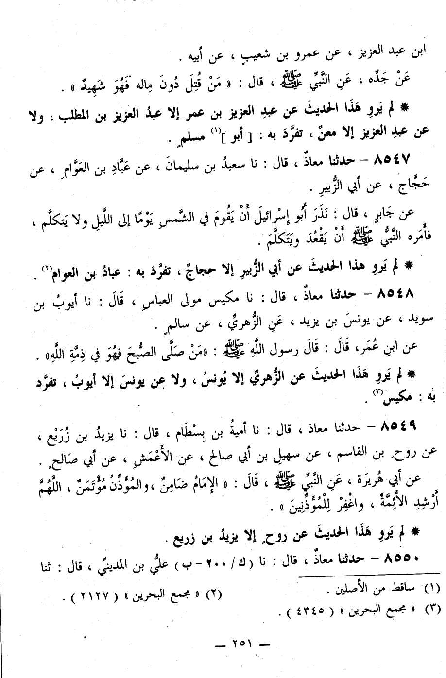 8547 - حَدَّثَنَا مُعَاذٌ قَالَ: نا سَعِيدُ بْنُ سُلَيْمَانَ، عَنْ عَبَّادِ بْنِ الْعَوَّامِ، عَنْ حَجَّاجٍ، عَنْ أَبِي الزُّبَيْرِ، عَنْ جَابِرٍ قَالَ: «§نَذَرَ أَبُو إِسْرَائِيلَ أَنْ يَقُومَ فِي الشَّمْسِ يَوْمًا إِلَى اللَّيْلِ وَلَا يَتَكَلَّمَ، فَأَمَرَهُ النَّبِيُّ صَلَّى اللهُ عَلَيْهِ وَسَلَّمَ أَنْ يَقْعُدَ وَيَتَكَلَّمَ»