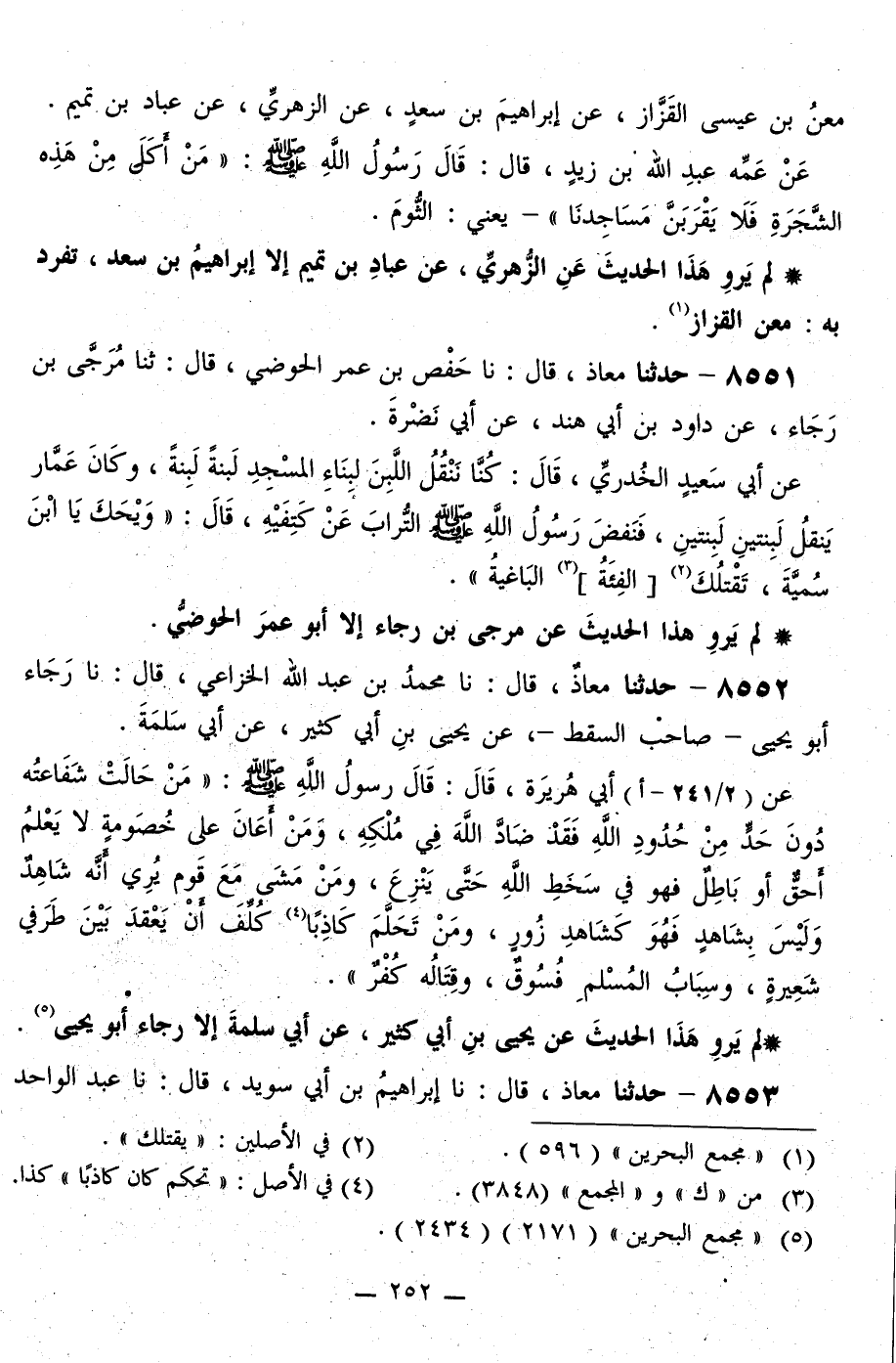 8552 - حَدَّثَنَا مُعَاذٌ قَالَ: نا مُحَمَّدُ بْنُ عَبْدِ اللَّهِ الْخُزَاعِيُّ قَالَ: نا رَجَاءٌ أَبُو يَحْيَى، صَاحِبُ السِّقْطِ، عَنْ يَحْيَى بْنِ أَبِي كَثِيرٍ، عَنْ أَبِي سَلَمَةَ، عَنْ أَبِي هُرَيْرَةَ قَالَ: قَالَ رَسُولُ اللَّهِ صَلَّى اللهُ عَلَيْهِ وَسَلَّمَ: «§مَنْ حَالَتْ شَفَاعَتُهُ دُونَ حَدٍّ مِنَ حُدُودِ اللَّهِ فَقَدْ ضَادَّ اللَّهَ فِي مُلْكِهِ، وَمَنْ أَعَانَ عَلَى خُصُومَةٍ لَا يَعْلَمُ أَحَقٌّ أَوْ بَاطِلٌ فَهُوَ فِي سَخَطِ اللَّهِ حَتَّى يَنْزِعَ، وَمَنْ مَشَى مَعَ قَوْمٍ يَرَى أَنَّهُ شَاهِدٌ وَلَيْسَ بِشَاهِدٍ فَهُوَ كَشَاهِدِ زُورٍ، وَمَنْ تَحَلَّمَ كَاذِبًا كُلِّفَ أَنْ يَعْقِدَ بَيْنَ طَرَفَيْ شَعِيرَةٍ، وِسِبَابُ الْمُسْلِمِ فُسُوقٌ، وَقِتَالُهُ كُفْرٌ»