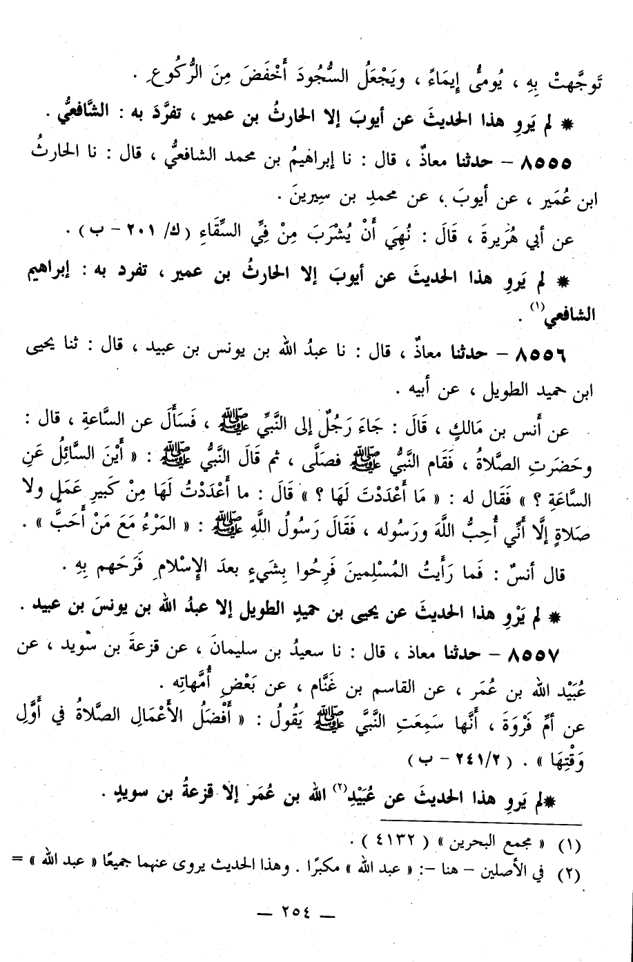8556 - حَدَّثَنَا مُعَاذٌ قَالَ: نا عَبْدُ اللَّهِ بْنُ يُونُسَ بْنِ عُبَيْدٍ قَالَ: ثَنَا يَحْيَى بْنُ حُمَيْدٍ الطَّوِيلُ، عَنْ أَبِيهِ، عَنْ أَنَسِ بْنِ مَالِكٍ قَالَ: جَاءَ رَجُلٌ إِلَى النَّبِيِّ صَلَّى اللهُ عَلَيْهِ وَسَلَّمَ، فَسَأَلَ عَنَ السَّاعَةِ قَالَ: وَحَضَرَتِ الصَّلَاةُ، فَقَامَ النَّبِيُّ صَلَّى اللهُ عَلَيْهِ وَسَلَّمَ فَصَلَّى، ثُمَّ قَالَ النَّبِيُّ صَلَّى اللهُ عَلَيْهِ وَسَلَّمَ: «أَيْنَ السَّائِلُ عَنِ السَّاعَةِ؟» فَقَالَ لَهُ: «مَا أَعْدَدْتَ لَهَا؟» قَالَ: مَا أَعْدَدْتُ لَهَا مِنْ كَبِيرِ عَمَلٍ وَلَا صَلَاةٍ إِلَّا أَنِّي أَحَبُّ اللَّهَ وَرَسُولَهُ، فَقَالَ رَسُولُ اللَّهِ صَلَّى اللهُ عَلَيْهِ وَسَلَّمَ: «§الْمَرْءُ مَعَ مَنْ أَحَبَّ» قَالَ أَنَسٌ: «فَمَا رَأَيْتُ الْمُسْلِمِينَ فَرِحُوا بِشَيْءٍ بَعْدَ الْإِسْلَامِ فَرَحَهُمْ بِهِ»