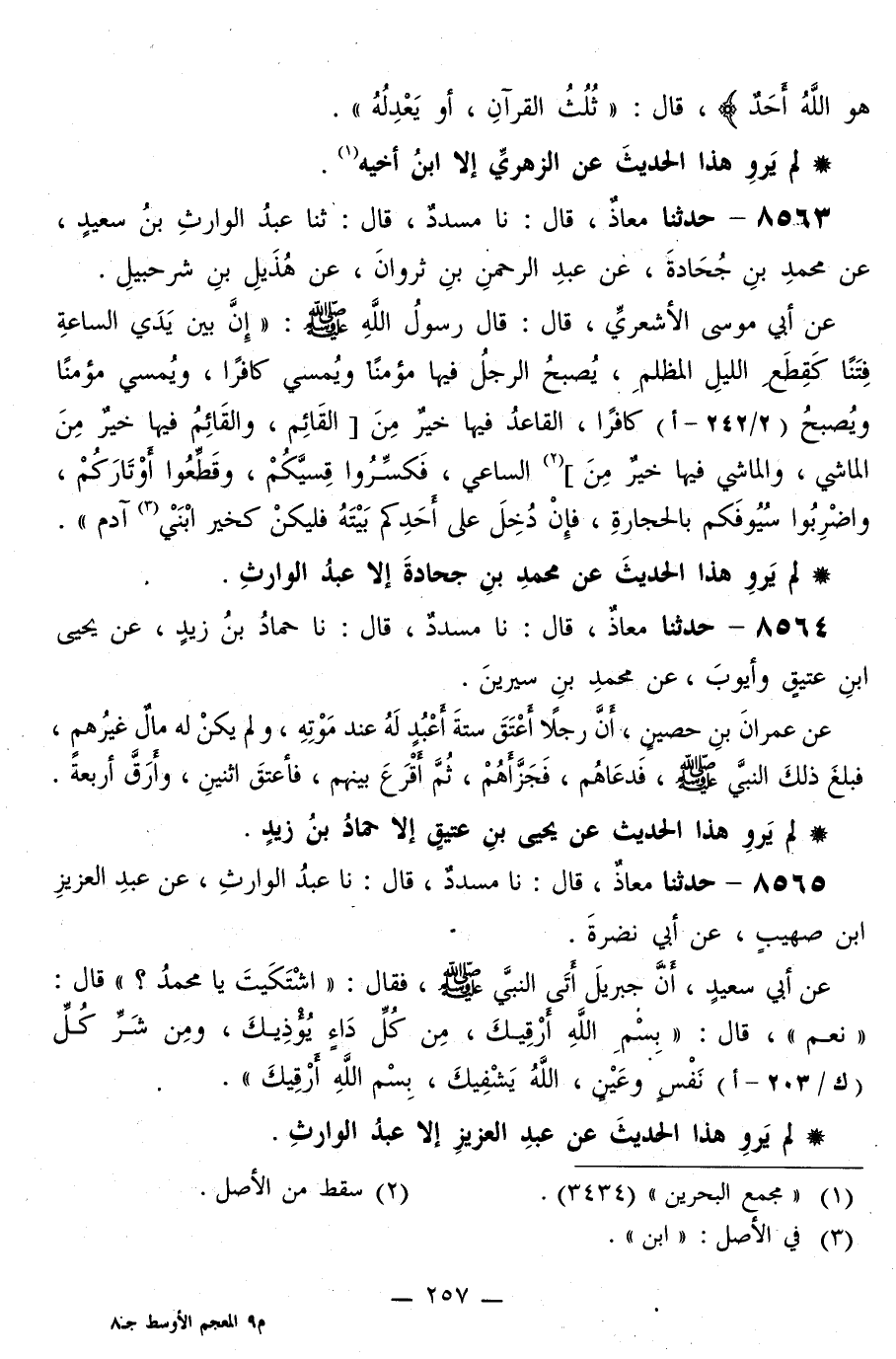 8563 - حَدَّثَنَا مُعَاذٌ قَالَ: نا مُسَدَّدٌ قَالَ: ثَنَا عَبْدُ الْوَارِثِ بْنُ سَعِيدٍ، عَنْ مُحَمَّدِ بْنِ جُحَادَةَ، عَنْ عَبْدِ الرَّحْمَنِ بْنِ ثَرْوَانَ، عَنْ هُذَيْلِ بْنِ شُرَحْبِيلَ، عَنْ أَبِي مُوسَى الْأَشْعَرِيِّ قَالَ: قَالَ رَسُولُ اللَّهِ صَلَّى اللهُ عَلَيْهِ وَسَلَّمَ: «إِنَّ §بَيْنَ يَدَيِ السَّاعَةِ فِتَنًا كَقِطَعِ اللَّيْلِ الْمُظْلِمِ، يُصْبِحُ الرَّجُلُ فِيهَا مُؤْمِنًا وَيُمْسِي كَافِرًا، وَيُمْسِي مُؤْمِنًا وَيُصْبِحُ كَافِرًا، الْقَاعِدُ فِيهَا خَيْرٌ مِنَ الْقَائِمِ، وَالْقَائِمُ فِيهَا خَيْرٌ مِنَ الْمَاشِي، وَالْمَاشِي فِيهَا خَيْرٌ مِنَ السَّاعِي، فَكَسِّرُوا قِسِيَّكُمْ، وَقَطِّعُوا أَوْتَارَكُمْ، وَاضْرِبُوا سُيُوفَكُمْ بِالْحِجَارَةِ، فَإِنْ دَخَلَ عَلَى أَحَدِكُمْ بَيْتَهُ فَلْيَكُنْ كَخَيْرِ ابْنَيْ آدَمَ»