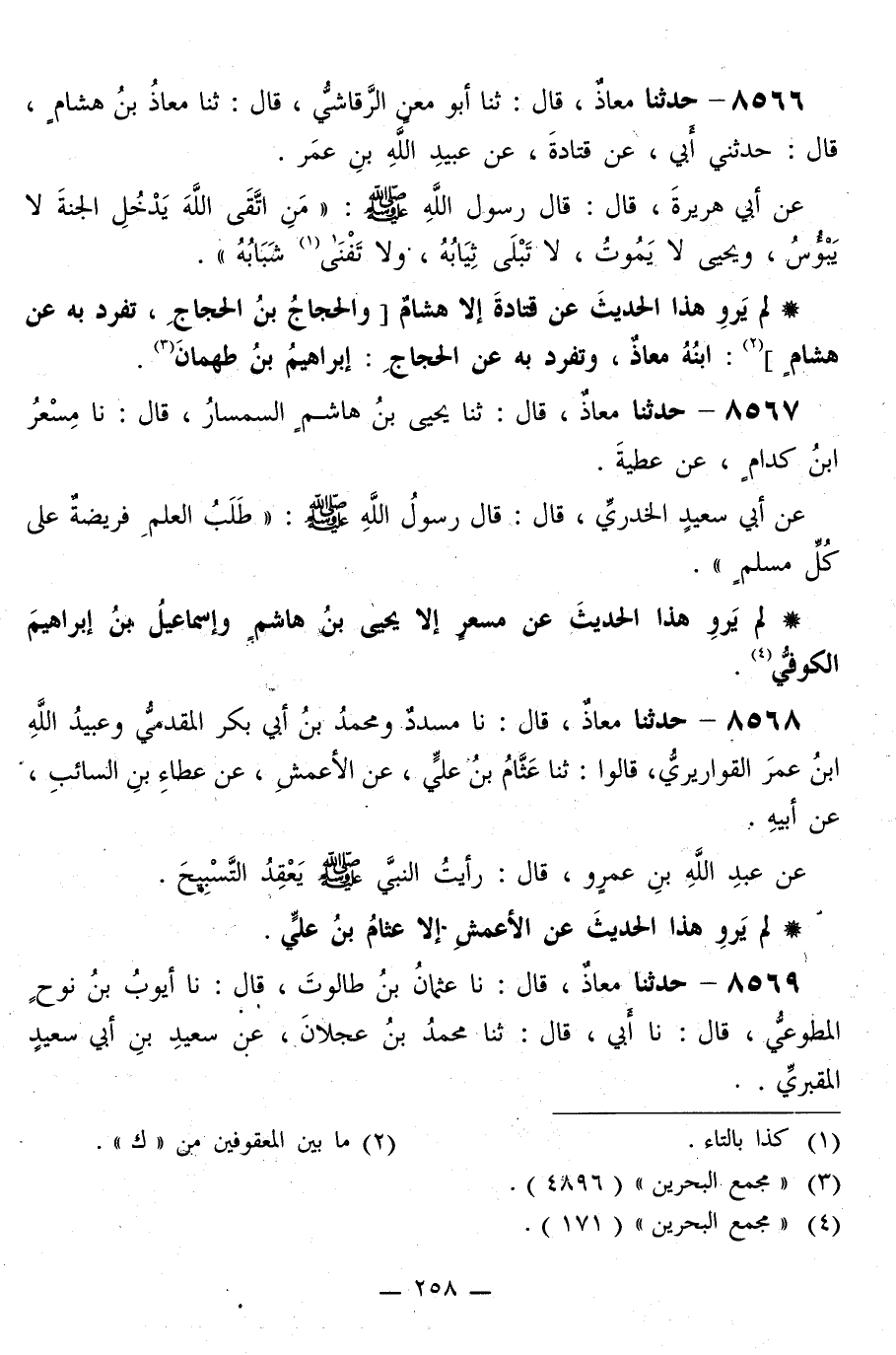 8567 - حَدَّثَنَا مُعَاذٌ قَالَ: ثَنَا يَحْيَى بْنُ هَاشِمٍ السِّمْسَارُ قَالَ: نا مِسْعَرُ بْنُ كِدَامٍ، عَنْ عَطِيَّةَ، عَنْ أَبِي سَعِيدٍ الْخُدْرِيِّ قَالَ: قَالَ رَسُولُ اللَّهِ صَلَّى اللهُ عَلَيْهِ وَسَلَّمَ: «§طَلَبُ الْعِلْمِ فَرِيضَةٌ عَلَى كُلِّ مُسْلِمٍ»