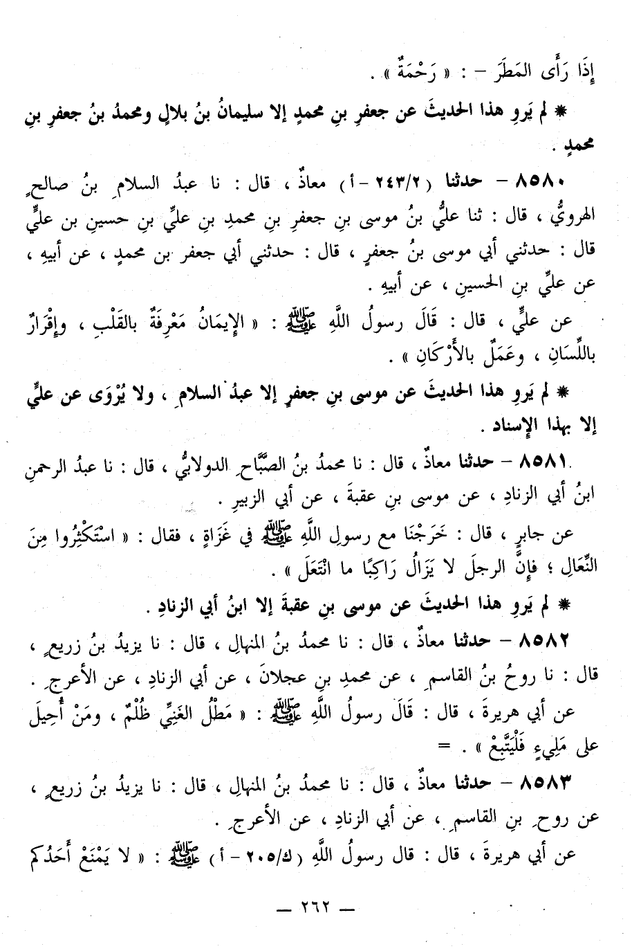 8580 - حَدَّثَنَا مُعَاذٌ قَالَ: نا عَبْدُ السَّلَامِ بْنُ صَالِحٍ الْهَرَوِيُّ قَالَ: ثَنَا عَلِيُّ بْنُ مُوسَى بْنِ جَعْفَرِ بْنِ مُحَمَّدِ بْنِ عَلِيِّ بْنِ حُسَيْنِ بْنِ عَلِيٍّ قَالَ: حَدَّثَنِي أَبِي مُوسَى بْنُ جَعْفَرٍ قَالَ: حَدَّثَنِي أَبِي جَعْفَرُ بْنُ مُحَمَّدٍ، عَنْ أَبِيهِ، عَنْ عَلِيِّ بْنِ الْحُسَيْنِ، عَنْ أَبِيهِ، عَنْ عَلِيٍّ قَالَ: قَالَ رَسُولُ اللَّهِ صَلَّى اللهُ عَلَيْهِ وَسَلَّمَ: «§الْإِيمَانُ مَعْرِفَةٌ بِالْقَلْبِ، وَإِقْرَارٌ بِاللِّسَانِ، وَعَمَلٌ بِالْأَرْكَانِ»