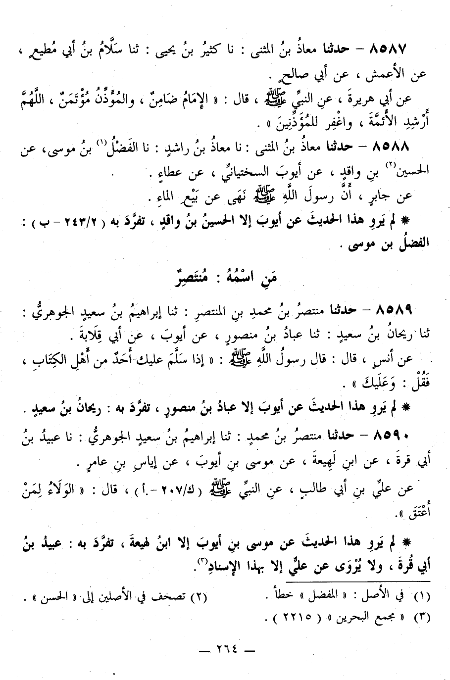 8589 - حَدَّثَنَا مُنْتَصِرُ بْنُ مُحَمَّدِ بْنِ الْمُنْتَصِرِ، ثَنَا إِبْرَاهِيمُ بْنُ سَعِيدٍ الْجَوْهَرِيُّ، ثَنَا رَيْحَانُ بْنُ سَعِيدٍ، ثَنَا عَبَّادُ بْنُ مَنْصُورٍ، عَنْ أَيُّوبَ، عَنْ أَبِي قِلَابَةَ، عَنْ أَنَسٍ قَالَ: قَالَ رَسُولُ اللَّهِ صَلَّى اللهُ عَلَيْهِ وَسَلَّمَ: «§إِذَا سَلَّمَ عَلَيْكَ أَحَدٌ مِنْ أَهْلِ الْكِتَابِ، فَقُلْ: وَعَلَيْكَ»