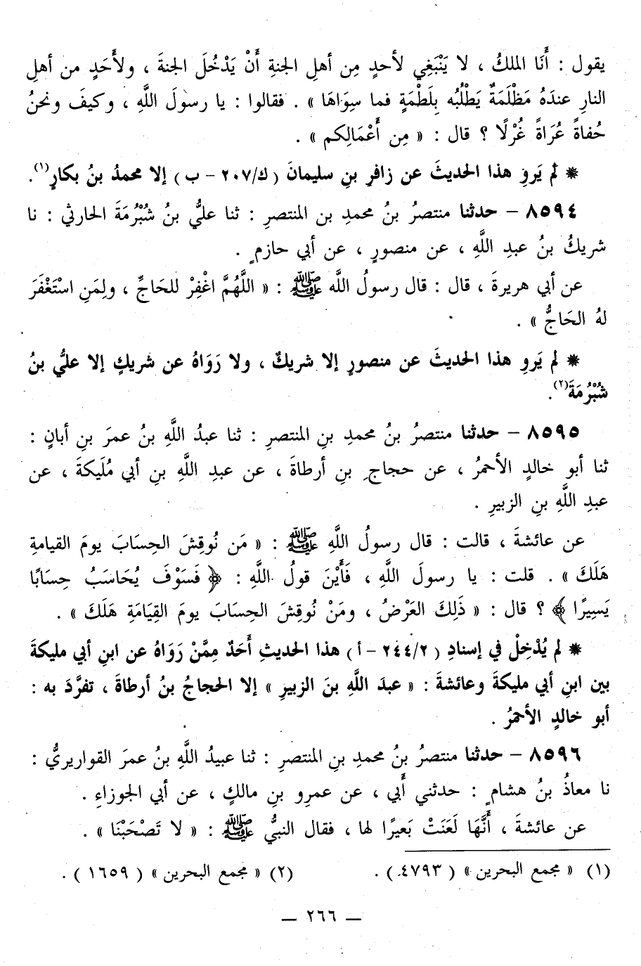 8595 - حَدَّثَنَا مُنْتَصِرُ بْنُ مُحَمَّدِ بْنِ الْمُنْتَصِرِ، ثَنَا عَبْدُ اللَّهِ بْنُ عُمَرَ بْنِ أَبَانَ، ثَنَا أَبُو خَالِدٍ الْأَحْمَرُ، عَنْ حَجَّاجِ بْنِ أَرْطَأَةَ، عَنْ عَبْدِ اللَّهِ بْنِ أَبِي مُلَيْكَةَ، عَنْ عَبْدِ اللَّهِ بْنِ الزُّبَيْرِ، عَنْ عَائِشَةَ، قَالَتْ: قَالَ رَسُولُ اللَّهِ صَلَّى اللهُ عَلَيْهِ وَسَلَّمَ: «§مَنْ نُوقِشَ الْحِسَابَ يَوْمَ الْقِيَامَةِ هَلَكَ» ، قُلْتُ: يَا رَسُولَ اللَّهِ، فَأَيْنَ قَوْلُ اللَّهِ: {فَسَوْفَ يُحَاسَبُ حِسَابًا يَسِيرًا} [الانشقاق: 8] ؟ قَالَ: «ذَلِكَ الْعَرْضُ، وَمَنْ نُوقِشَ الْحِسَابَ يَوْمَ الْقِيَامَةِ هَلَكَ» لَمْ يُدْخِلْ فِي إِسْنَادِ هَذَا الْحَدِيثِ أَحَدٌ مِمَّنْ رَوَاهُ عَنِ ابْنِ أَبِي مُلَيْكَةَ بَيْنَ ابْنِ أَبِي مُلَيْكَةَ، وَعَائِشَةَ: عَبْدَ اللَّهِ بْنَ الزُّبَيْرِ إِلَّا الْحَجَّاجُ بْنُ أَرْطَأَةَ، تَفَرَّدَ بِهِ: أَبُو خَالِدُ الْأَحْمَرُ "