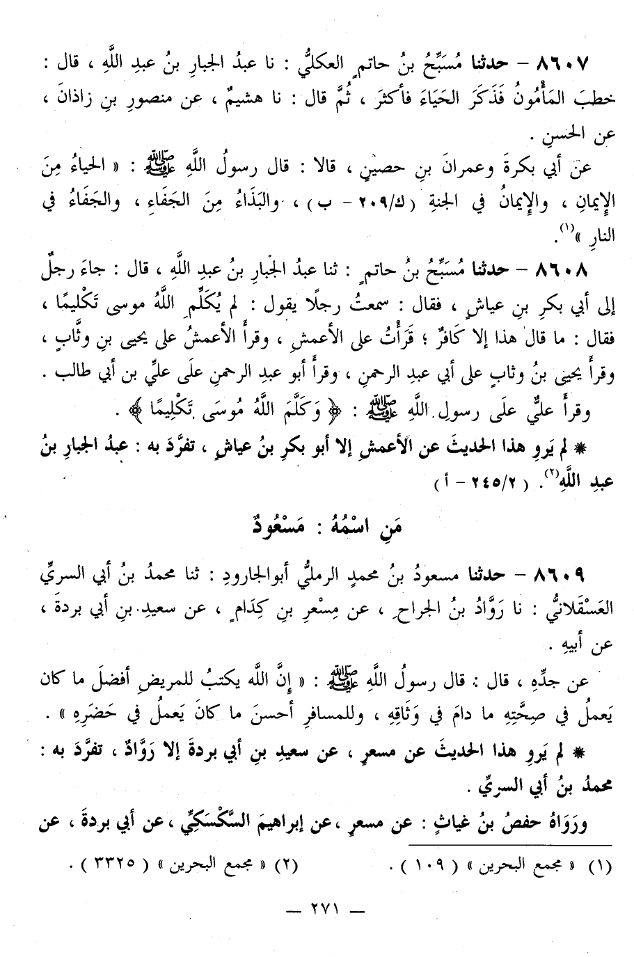 8608 - حَدَّثَنَا مُسَبِّحُ بْنُ حَاتِمٍ، ثَنَا عَبْدُ الْجَبَّارِ بْنُ عَبْدِ اللَّهِ قَالَ: جَاءَ رَجُلٌ إِلَى أَبِي بَكْرِ بْنِ عَيَّاشٍ، فَقَالَ: سَمِعْتُ رَجُلًا يَقُولُ: لَمْ يُكَلِّمِ اللَّهُ مُوسَى تَكْلِيمًا، فَقَالَ: مَا قَالَ هَذَا إِلَّا كَافِرٌ، قَرَأْتُ عَلَى الْأَعْمَشِ، وَقَرَأَ الْأَعْمَشُ عَلَى يَحْيَى بْنِ وَثَّابٍ، وَقَرَأَ يَحْيَى بْنُ وَثَّابٍ عَلَى أَبِي عَبْدِ الرَّحْمَنِ، وَقَرَأَ أَبُو عَبْدِ الرَّحْمَنِ عَلَى عَلِيِّ بْنِ أَبِي طَالِبٍ، وَقَرَأَ عَلِيٌّ، عَلَى رَسُولِ اللَّهِ صَلَّى اللهُ عَلَيْهِ وَسَلَّمَ: « {§وَكَلَّمَ اللَّهُ مُوسَى تَكْلِيمًا} [النساء: 164] »