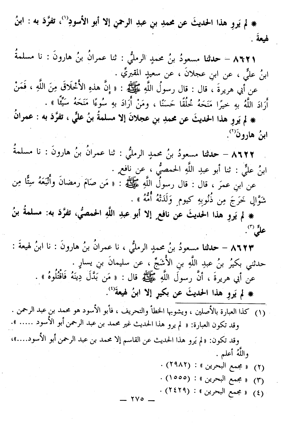 8623 - حَدَّثَنَا مَسْعُودُ بْنُ مُحَمَّدٍ الرَّمْلِيُّ، نا عِمْرَانُ بْنُ هَارُونَ، نا ابْنُ لَهِيعَةَ، حَدَّثَنِي بُكَيْرُ بْنُ عَبْدِ اللَّهِ بْنِ الْأَشَجِّ، عَنْ سُلَيْمَانَ بْنِ يَسَارٍ، عَنْ أَبِي هُرَيْرَةَ، أَنَّ رَسُولَ اللَّهِ صَلَّى اللهُ عَلَيْهِ وَسَلَّمَ قَالَ: «§مَنْ بَدَّلَ دِينَهُ فَاقْتُلُوهُ»