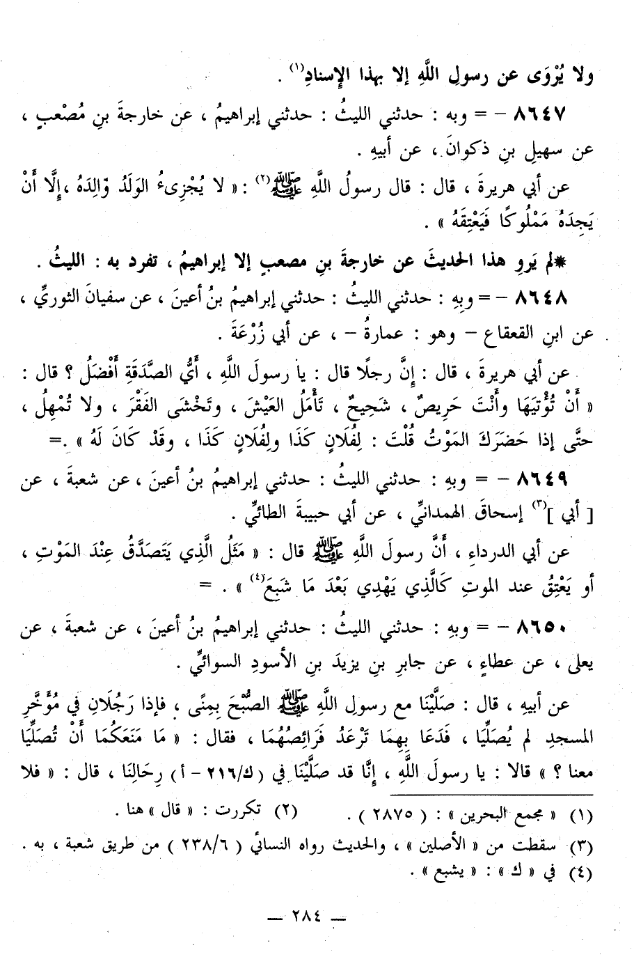 8647 - وَبِهِ: حَدَّثَنِي اللَّيْثُ، حَدَّثَنِي إِبْرَاهِيمُ، عَنْ خَارِجَةَ بْنِ مُصْعَبٍ، عَنْ سُهَيْلِ بْنِ ذَكْوَانَ، عَنْ أَبِيهِ، عَنْ أَبِي هُرَيْرَةَ قَالَ: قَالَ رَسُولُ اللَّهِ صَلَّى اللهُ عَلَيْهِ وَسَلَّمَ: «§لَا يُجْزِئُ الْوَلَدُ وَالِدَهُ، إِلَّا أَنْ يَجِدَهُ مَمْلُوكًا فَيَعْتِقَهُ»