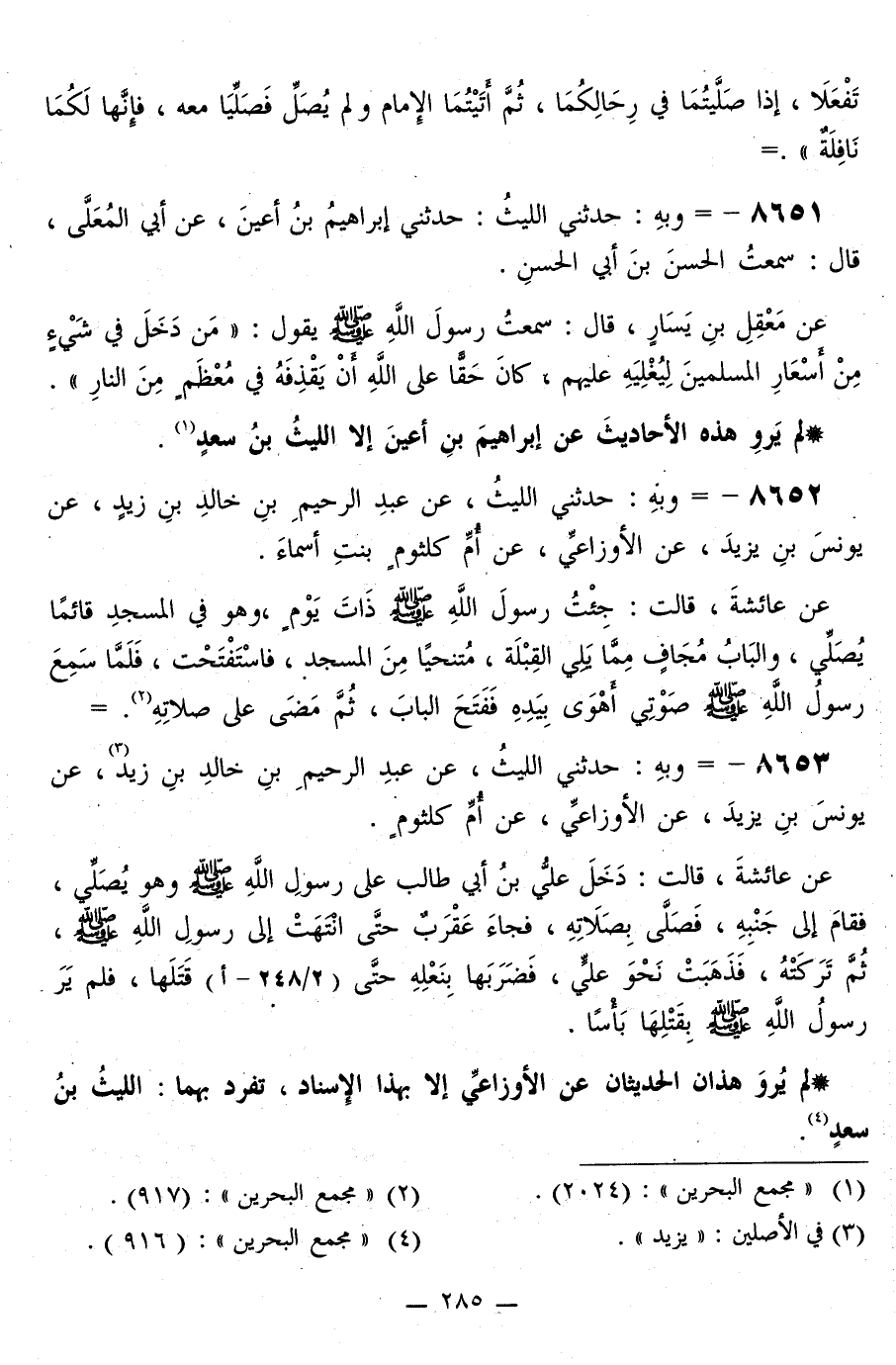 8653 - وَبِهِ: حَدَّثَنِي اللَّيْثُ، عَنْ عَبْدِ الرَّحِيمِ بْنِ خَالِدِ بْنِ زَيْدٍ، عَنْ يُونُسَ بْنِ يَزِيدَ، عَنِ الْأَوْزَاعِيِّ، عَنْ أُمِّ كُلْثُومٍ، عَنْ عَائِشَةَ، قَالَتْ: «§دَخَلَ عَلِيُّ بْنُ أَبِي طَالِبٍ عَلَى رَسُولِ اللَّهِ صَلَّى اللهُ عَلَيْهِ وَسَلَّمَ وَهُوَ يُصَلِّي، فَقَامَ إِلَى جَنْبِهِ، فَصَلَّى بِصَلَاتِهِ، فَجَاءَ عَقْرَبٌ حَتَّى انْتَهَتْ إِلَى رَسُولِ اللَّهِ صَلَّى اللهُ عَلَيْهِ وَسَلَّمَ، ثُمَّ تَرَكَتْهُ، فَذَهَبَتْ نَحْوَ عَلِيٍّ، فَضَرَبَهَا بِنَعْلِهِ حَتَّى قَتَلَهَا، فَلَمْ يَرَ رَسُولُ اللَّهِ صَلَّى اللهُ عَلَيْهِ وَسَلَّمَ بِقَتْلِهَا بَأْسًا»