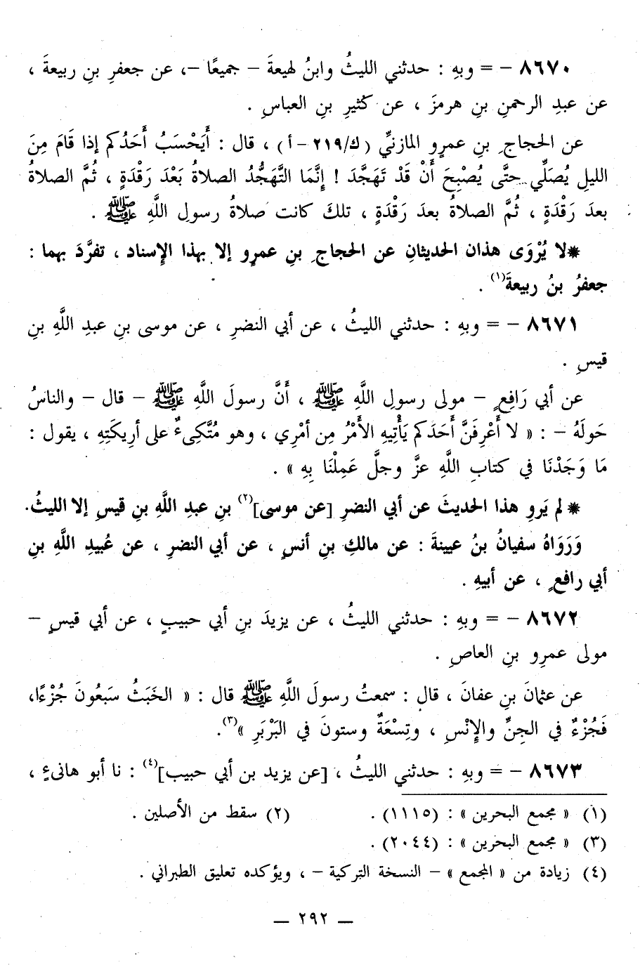 8670 - وَبِهِ: حَدَّثَنِي اللَّيْثُ، وَابْنُ لَهِيعَةَ، جَمِيعًا، عَنْ جَعْفَرِ بْنِ رَبِيعَةَ، عَنْ عَبْدِ الرَّحْمَنِ بْنِ هُرْمُزَ، عَنْ كَثِيرِ بْنِ الْعَبَّاسِ، عَنِ الْحَجَّاجِ بْنِ عَمْرٍو الْمَازِنِيِّ قَالَ: «أَيَحْسَبُ أَحَدُكُمْ إِذَا قَامَ مِنَ اللَّيْلِ يُصَلِّي حَتَّى يُصْبِحَ أَنْ قَدْ تَهَجَّدَ إِنَّمَا §التَّهَجُّدُ الصَّلَاةُ بَعْدَ رَقْدَةٍ، ثُمَّ الصَّلَاةُ بَعْدَ رَقْدَةٍ، ثُمَّ الصَّلَاةُ بَعْدَ رَقْدَةٍ، تِلْكَ كَانَتْ صَلَاةَ رَسُولِ اللَّهِ صَلَّى اللهُ عَلَيْهِ وَسَلَّمَ»