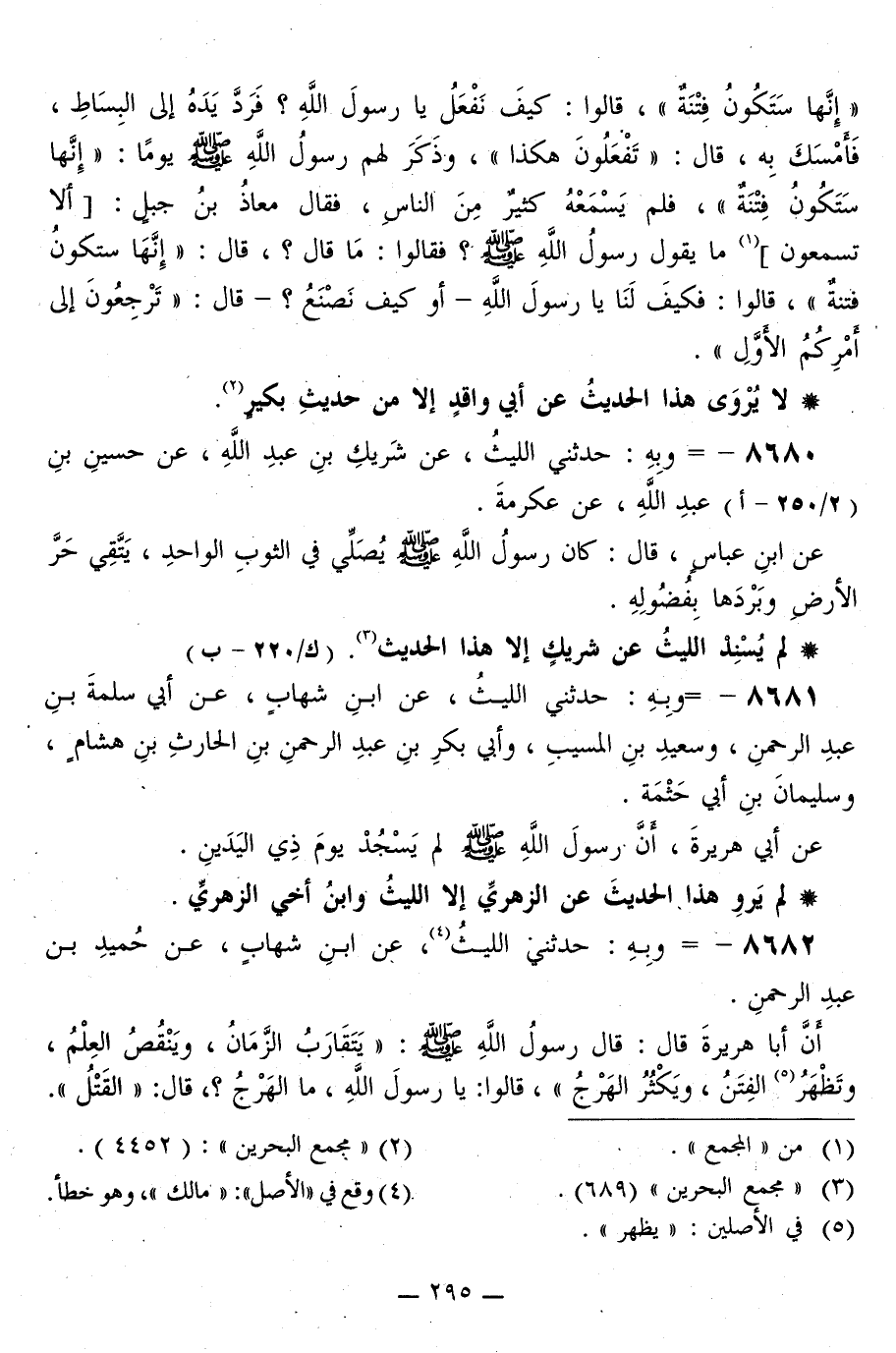 8682 - وَبِهِ: حَدَّثَنِي اللَّيْثُ، عَنِ ابْنِ شِهَابٍ، عَنْ حُمَيْدِ بْنِ عَبْدِ الرَّحْمَنِ، أَنَّ أَبَا هُرَيْرَةَ قَالَ: قَالَ رَسُولُ اللَّهِ صَلَّى اللهُ عَلَيْهِ وَسَلَّمَ: «§يَتَقَارَبُ الزَّمَانُ، وَيَنْقُصُ الْعِلْمُ، وَتَظْهَرُ الْفِتَنُ، وَيَكْثُرُ الْهَرْجُ» ، قَالُوا: يَا رَسُولَ اللَّهِ، مَا الْهَرْجُ؟ قَالَ: «الْقَتْلُ» -[296]- لَمْ يَرْوِ هَذَا الْحَدِيثَ عَنِ الزُّهْرِيِّ، عَنْ حُمَيْدٍ إِلَّا اللَّيْثُ، وَابْنُ أَخِي الزُّهْرِيِّ "