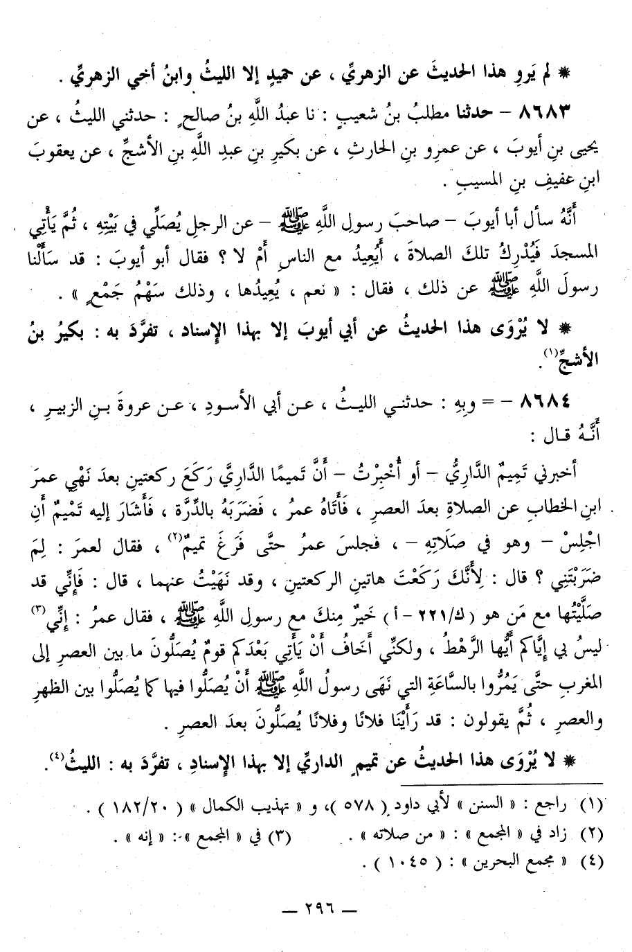 8684 - وَبِهِ: حَدَّثَنِي اللَّيْثُ، عَنْ أَبِي الْأَسْوَدِ، عَنْ عُرْوَةَ بْنِ الزُّبَيْرِ، أَنَّهُ قَالَ: أَخْبَرَنِي تَمِيمٌ الدَّارِيُّ، أَوْ أُخْبِرْتُ أَنَّ تَمِيمًا الدَّارِيَّ «§رَكَعَ رَكْعَتَيْنِ بَعْدَ نَهْيِ عُمَرَ بْنِ الْخَطَّابِ عَنِ الصَّلَاةِ بَعْدَ الْعَصْرِ» ، فَأَتَاهُ عُمَرُ، فَضَرَبَهُ بِالدِّرَّةِ، فَأَشَارَ إِلَيْهِ تَمِيمٌ أَنِ اجْلِسْ وَهُوَ فِي صَلَاتِهِ، فَجَلَسَ عُمَرُ حَتَّى فَرَغَ تَمِيمٌ، فَقَالَ لِعُمَرَ: لِمَ ضَرَبْتَنِي؟ قَالَ: لِأَنَّكَ رَكَعْتَ هَاتَيْنِ الرَّكْعَتَيْنِ، وَقَدْ نَهَيْتُ عَنْهُمَا قَالَ: «فَإِنِّي قَدْ صَلَّيْتُهَا مَعَ مَنْ هُوَ خَيْرٌ مِنْكَ مَعَ رَسُولِ اللَّهِ صَلَّى اللهُ عَلَيْهِ وَسَلَّمَ» فَقَالَ عُمَرُ: «إِنِّي لَيْسَ بِي إِيَّاكُمْ أَيُّهَا الرَّهْطُ، وَلَكِنِّي أَخَافُ أَنْ يَأْتِيَ بَعْدَكُمْ قَوْمٌ يُصَلُّونَ مَا بَيْنَ الْعَصْرِ إِلَى الْمَغْرِبِ حَتَّى يَمُرُّوا بِالسَّاعَةِ الَّتِي نَهَى رَسُولُ اللَّهِ صَلَّى اللهُ عَلَيْهِ وَسَلَّمَ أَنْ يُصَلُّوا فِيهَا كَمَا يُصَلُّوا بَيْنَ الظُّهْرِ وَالْعَصْرِ، ثُمَّ يَقُولُونَ: قَدْ رَأَيْنَا فُلَانًا وَفُلَانًا يُصَلُّونَ بَعْدَ الْعَصْرِ»