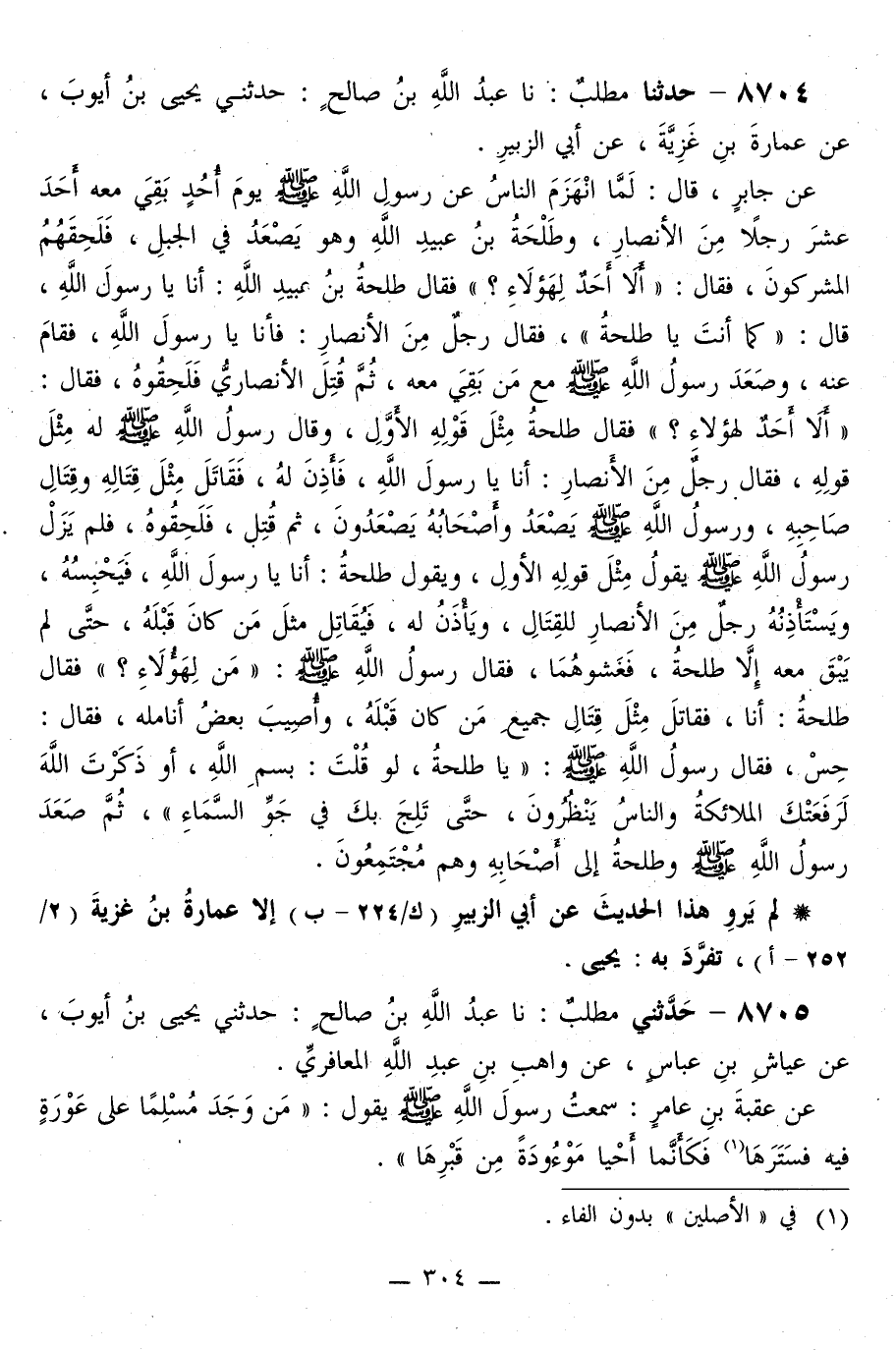 8704 - حَدَّثَنَا مُطَّلِبٌ، نا عَبْدُ اللَّهِ بْنُ صَالِحٍ، حَدَّثَنِي يَحْيَى بْنُ أَيُّوبَ، عَنْ عُمَارَةَ بْنِ غَزِيَّةَ، عَنْ أَبِي الزُّبَيْرِ، عَنْ جَابِرٍ قَالَ: لَمَّا انْهَزَمَ النَّاسُ عَنْ رَسُولِ اللَّهِ صَلَّى اللهُ عَلَيْهِ وَسَلَّمَ يَوْمَ أُحُدٍ بَقِيَ مَعَهُ أَحَدَ عَشَرَ رَجُلًا مِنَ الْأَنْصَارِ، وَطَلْحَةُ بْنُ عُبَيْدِ اللَّهِ وَهُوَ يَصْعَدُ فِي الْجَبَلِ، فَلَحِقَهُمُ الْمُشْرِكُونَ، فَقَالَ: «أَلَا أَحَدٌ لِهَؤُلَاءِ؟» فَقَالَ طَلْحَةُ بْنُ عُبَيْدِ اللَّهِ: أَنَا يَا رَسُولَ اللَّهِ قَالَ: «كَمَا أَنْتَ يَا طَلْحَةُ» فَقَالَ رَجُلٌ مِنَ الْأَنْصَارِ: «فَأَنَا يَا رَسُولَ اللَّهِ، فَقَامَ عَنْهُ، وَصَعِدَ رَسُولُ اللَّهِ صَلَّى اللهُ عَلَيْهِ وَسَلَّمَ مَعَ مَنْ بَقِيَ مَعَهُ، ثُمَّ قُتِلَ الْأَنْصَارِيُّ فَلَحِقُوهُ، فَقَالَ:» أَلَا أَحَدٌ لِهَؤُلَاءِ؟ «فَقَالَ طَلْحَةُ مِثْلَ قَوْلِهِ الْأَوَّلِ، وَقَالَ رَسُولُ اللَّهِ صَلَّى اللهُ عَلَيْهِ وَسَلَّمَ لَهُ مِثْلَ قَوْلِهِ، فَقَالَ رَجُلٌ مِنَ الْأَنْصَارِ: أَنَا يَا رَسُولَ اللَّهِ، فَأَذِنَ لَهُ، فَقَاتَلَ مِثْلَ قِتَالِهِ وَقِتَالِ صَاحِبِهِ، وَرَسُولُ اللَّهِ صَلَّى اللهُ عَلَيْهِ وَسَلَّمَ يَصْعَدُ وَأَصْحَابُهُ يَصْعَدُونَ، ثُمَّ قُتِلَ، فَلَحِقُوهُ، فَلَمْ يَزَلْ رَسُولُ اللَّهِ صَلَّى اللهُ عَلَيْهِ وَسَلَّمَ يَقُولُ مِثْلَ قَوْلِهِ الْأَوَّلِ، وَيَقُولُ طَلْحَةُ: أَنَا يَا رَسُولَ اللَّهِ، فَيَحْبِسُهُ، وَيَسْتَأْذِنُهُ رَجُلٌ مِنَ الْأَنْصَارِ لِلْقِتَالِ، وَيَأْذَنُ لَهُ، فَيُقَاتِلُ مِثْلَ مَنْ كَانَ قَبْلَهُ، حَتَّى لَمْ يَبْقَ مَعَهُ إِلَّا طَلْحَةُ، فَغَشَوْهُمَا، فَقَالَ رَسُولُ اللَّهِ صَلَّى اللهُ عَلَيْهِ وَسَلَّمَ:» §مَنْ لِهَؤُلَاءِ؟ «فَقَالَ طَلْحَةُ: أَنَا، فَقَاتَلَ مِثْلَ قِتَالِ جَمِيعِ مَنْ كَانَ قَبْلَهُ، وَأُصِيبَ بَعْضُ أَنَامِلِهِ، فَقَالَ: حِسْ، فَقَالَ رَسُولُ اللَّهِ صَلَّى اللهُ عَلَيْهِ وَسَلَّمَ:» يَا طَلْحَةُ، لَوْ قُلْتَ: بِسْمِ اللَّهِ، أَوْ ذَكَرْتَ اللَّهَ لَرَفَعَتْكَ الْمَلَائِكَةُ وَالنَّاسُ يَنْظُرُونَ، حَتَّى تَلِجَ بِكَ فِي جَوِّ السَّمَاءِ «، ثُمَّ صَعِدَ رَسُولُ اللَّهِ صَلَّى اللهُ عَلَيْهِ وَسَلَّمَ وَطَلْحَةُ إِلَى أَصْحَابِهِ وَهُمْ مُجْتَمِعُونَ»