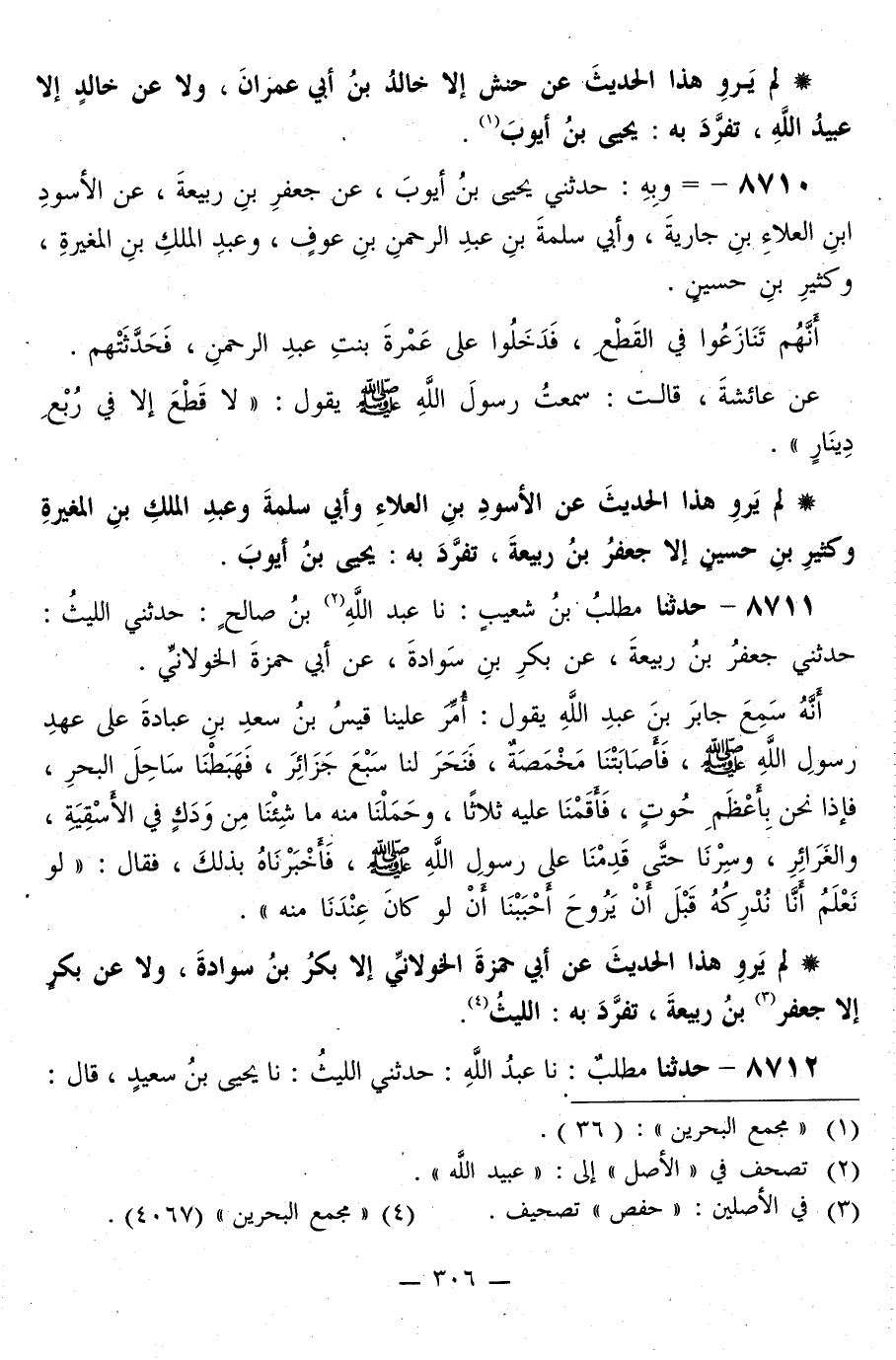 8710 - وَبِهِ: حَدَّثَنِي يَحْيَى بْنُ أَيُّوبَ، عَنْ جَعْفَرِ بْنِ رَبِيعَةَ، عَنِ الْأَسْوَدِ بْنِ الْعَلَاءِ بْنِ جَارِيَةَ، وَأَبِي سَلَمَةَ بْنِ عَبْدِ الرَّحْمَنِ بْنِ عَوْفٍ، وَعَبْدِ الْمَلِكِ بْنِ الْمُغِيرَةِ، وَكَثِيرِ بْنِ حُسَيْنٍ، أَنَّهُمْ تَنَازَعُوا فِي الْقَطْعِ، فَدَخَلُوا عَلَى عَمْرَةَ بِنْتِ عَبْدِ الرَّحْمَنِ، فَحَدَّثَتْهُمْ، عَنْ عَائِشَةَ، قَالَتْ: سَمِعْتُ رَسُولَ اللَّهِ صَلَّى اللهُ عَلَيْهِ وَسَلَّمَ يَقُولُ: «§لَا قَطْعَ إِلَّا فِي رُبْعِ دِينَارٍ»