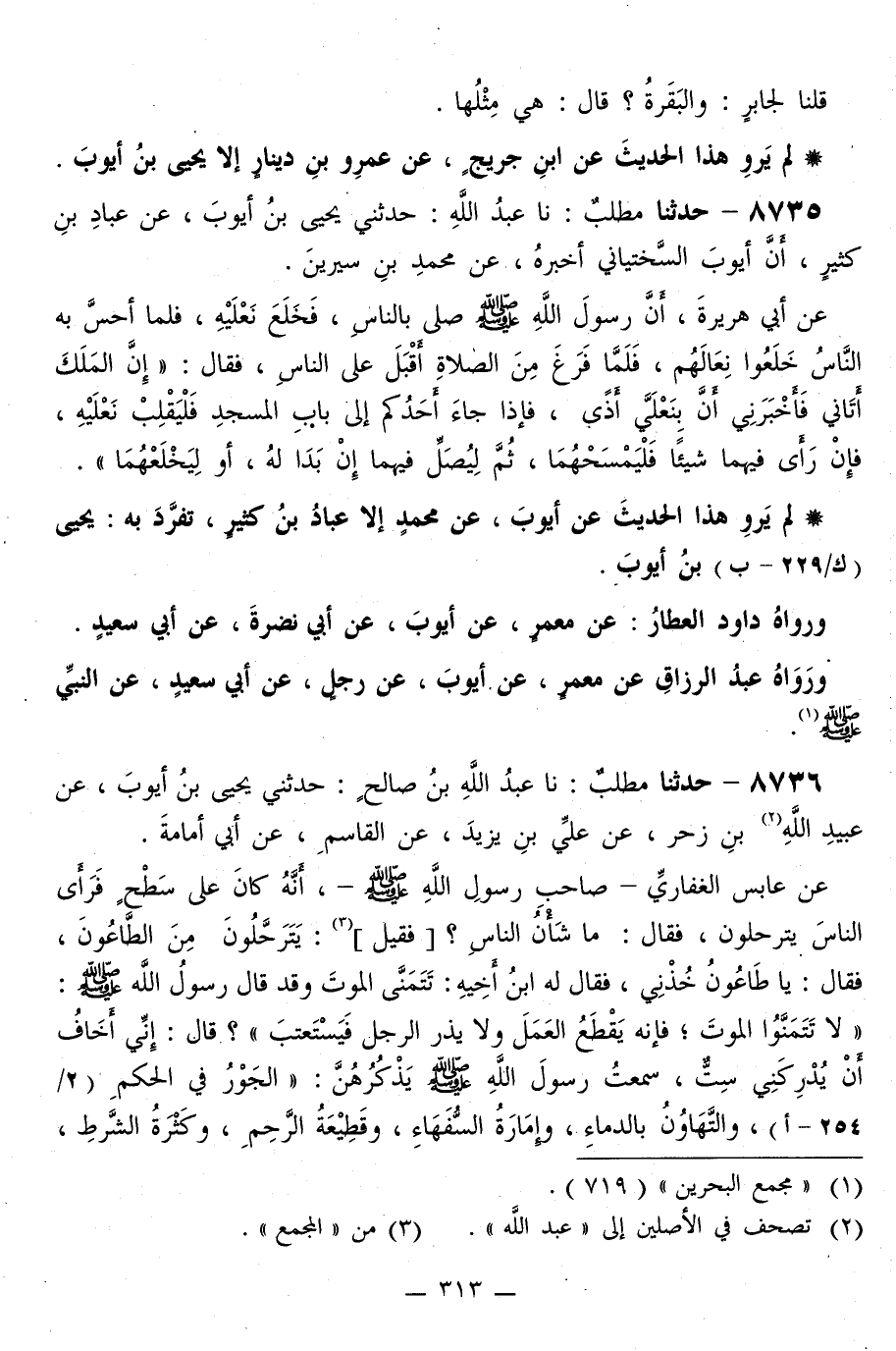 8735 - حَدَّثَنَا مُطَّلِبٌ، نا عَبْدُ اللَّهِ، حَدَّثَنِي يَحْيَى بْنُ أَيُّوبَ، عَنْ عَبَّادِ بْنِ كَثِيرٍ، عَنْ أَيُّوبَ السَّخْتِيَانِيِّ، أَخْبَرَهُ عَنْ مُحَمَّدِ بْنِ سِيرِينَ، عَنْ أَبِي هُرَيْرَةَ، أَنَّ رَسُولَ اللَّهِ صَلَّى اللهُ عَلَيْهِ وَسَلَّمَ صَلَّى بِالنَّاسِ، فَخَلَعَ نَعْلَيْهِ، فَلَمَّا أَحَسَّ بِهِ النَّاسُ خَلَعُوا نِعَالَهُمْ، فَلَمَّا فَرَغَ مِنَ الصَّلَاةِ أَقْبَلَ عَلَى النَّاسِ، فَقَالَ: «إِنَّ §الْمَلَكَ أَتَانِي، فَأَخْبَرَنِي أَنَّ بِنَعْلَيَّ أَذًى، فَإِذَا جَاءَ أَحَدُكُمْ إِلَى بَابِ الْمَسْجِدِ فَلْيَقْلِبْ نَعْلَيْهِ، فَإِنْ رَأَى فِيهِمَا شَيْئًا فَلْيَمْسَحْهُمَا، ثُمَّ لِيُصِلِّ فِيهِمَا إِنْ بَدَا لَهُ، أَوْ لِيَخْلَعْهُمَا»
