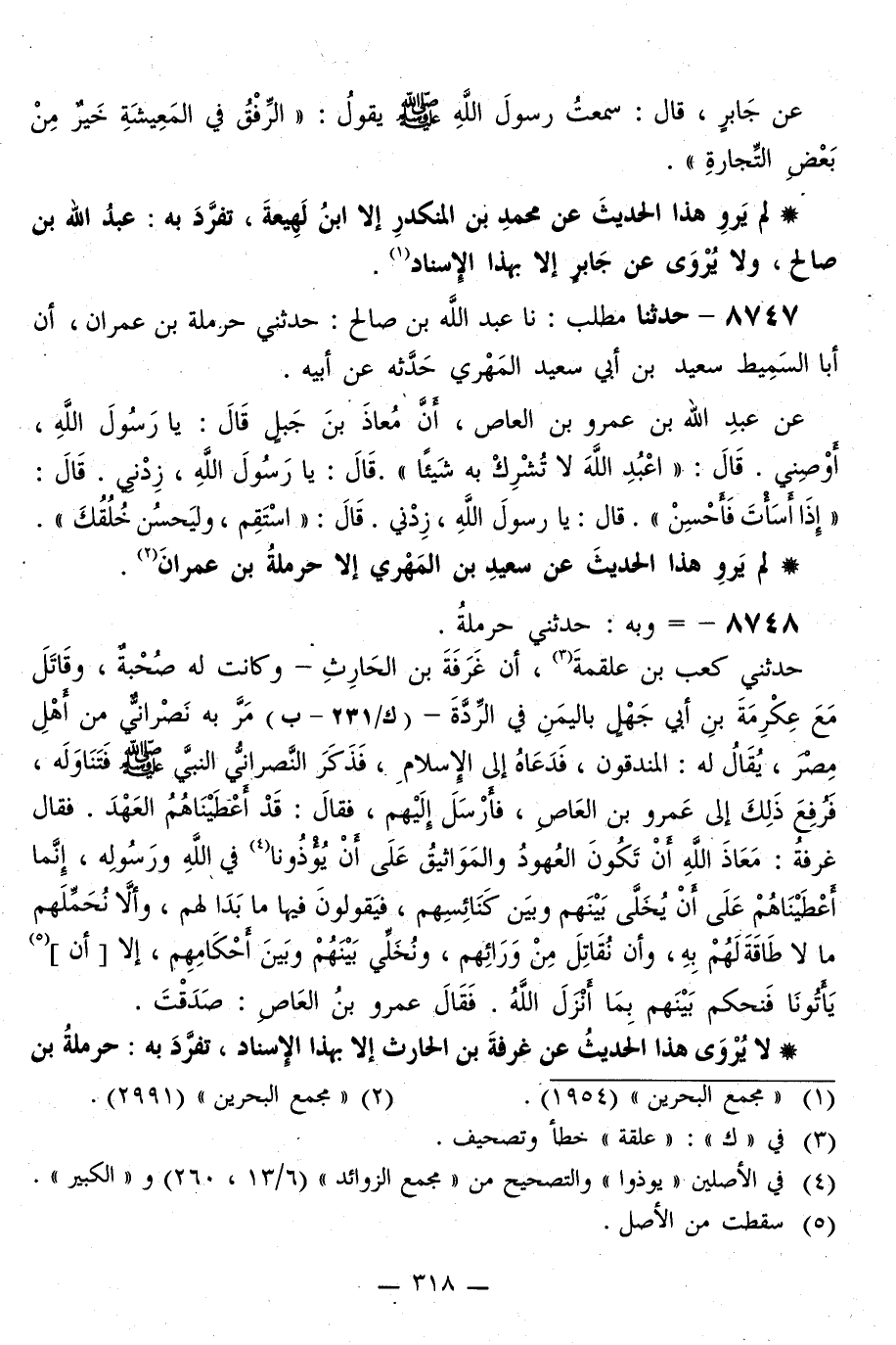 8748 - وَبِهِ، حَدَّثَنِي حَرْمَلَةُ، حَدَّثَنِي كَعْبُ بْنُ عَلْقَمَةَ، أَنَّ غَرَفَةَ بْنَ الْحَارِثِ وَكَانَتْ لَهُ صُحْبَةٌ، وَقَاتَلَ مَعَ عِكْرِمَةَ بْنِ أَبِي جَهْلٍ بِالْيَمَنِ فِي الرِّدَّةِ، مَرَّ بِهِ نَصْرَانِيٌّ مِنْ أَهْلِ مِصْرَ، يُقَالُ لَهُ: الْمَنْدِقُونُ، فَدَعَاهُ إِلَى الْإِسْلَامِ، فَذَكَرَ النَّصْرَانِيُّ النَّبِيَّ صَلَّى اللهُ عَلَيْهِ وَسَلَّمَ فَتَنَاوَلَهُ، فَرَفَعَ ذَلِكَ إِلَى عَمْرِو بْنِ الْعَاصِ، فَأَرْسَلَ إِلَيْهِمْ، فَقَالَ: قَدْ أَعْطَيْنَاهُمُ الْعَهْدَ، فَقَالَ غَرَفَةُ: «§مَعَاذَ اللَّهِ أَنْ تَكُونَ الْعُهُودُ وَالْمَوَاثِيقُ عَلَى أَنْ يُؤْذُونَا فِي اللَّهِ وَرَسُولِهِ، إِنَّمَا أَعْطَيْنَاهُمْ عَلَى أَنْ يُخَلَّى بَيْنَهُمْ وَبَيْنَ كَنَائِسِهِمْ، فَيَقُولُونَ فِيهَا مَا بَدَا لَهُمْ، وَأَلَّا نَحْمِلَهُمْ مَا لَا طَاقَةَ لَهُمْ بِهِ، وَأَنْ نُقَاتِلَ مَنْ وَرَائَهُمْ، وَنُخَلِّي بَيْنَهُمْ وَبَيْنَ أَحْكَامِهِمْ، إِلَّا أَنْ يَأْتُونَا فَنَحْكُمَ بَيْنَهُمْ بِمَا أَنْزَلَ اللَّهُ» ، فَقَالَ عَمْرُو بْنُ الْعَاصِ: «صَدَقْتَ»
