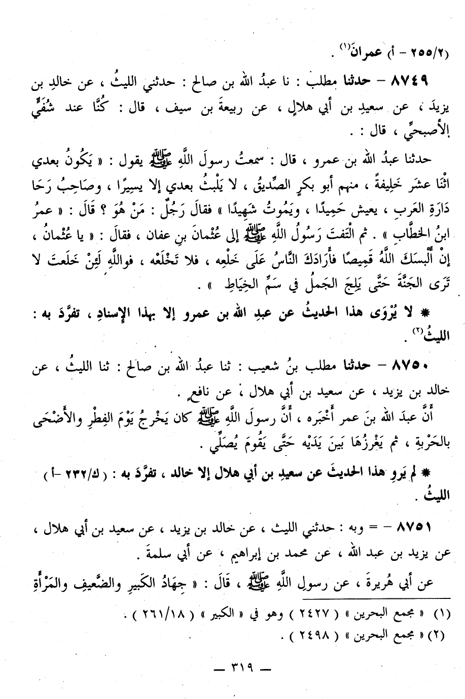 8749 - حَدَّثَنَا مُطَّلِبٌ، نا عَبْدُ اللَّهِ بْنُ صَالِحٍ، حَدَّثَنِي اللَّيْثُ، عَنْ خَالِدِ بْنِ يَزِيدَ، عَنْ سَعِيدِ بْنِ أَبِي هِلَالٍ، عَنْ رَبِيعَةَ بْنِ سَيْفٍ قَالَ: كُنَّا عِنْدَ شُفَيٍّ الْأَصْبَحِيِّ قَالَ: حَدَّثَنَا عَبْدُ اللَّهِ بْنُ عَمْرٍو قَالَ: سَمِعْتُ رَسُولَ اللَّهِ صَلَّى اللهُ عَلَيْهِ وَسَلَّمَ، يَقُولُ: «§يَكُونُ بَعْدِي اثْنَا عَشَرَ خَلِيفَةً، مِنْهُمْ أَبُو بَكْرٍ الصِّدِّيقُ، لَا يَلْبَثُ بَعْدِي إِلَّا يَسِيرًا، وَصَاحِبُ رَحَا دَارَةِ الْعَرَبِ، يَعِيشُ حَمِيدًا، وَيَمُوتُ شَهِيدًا» ، فَقَالَ رَجُلٌ: مَنْ هُوَ؟ قَالَ: «عُمَرُ بْنُ الْخَطَّابِ» . ثُمَّ الْتَفَتَ رَسُولُ اللَّهِ صَلَّى اللهُ عَلَيْهِ وَسَلَّمَ إِلَى عُثْمَانَ بْنِ عَفَّانَ، فَقَالَ: «يَا عُثْمَانُ، إِنْ أَلْبَسَكَ اللَّهُ قَمِيصًا فَأَرَادَكَ النَّاسُ عَلَى خَلْعِهِ، فَلَا تَخْلَعْهُ، فَوَاللَّهِ لَئِنْ خَلَعْتَ لَا تَرَى الْجَنَّةَ حَتَّى يَلِجَ الْجَمَلُ فِي سَمِّ الْخِيَاطِ» لَا يُرْوَى هَذَا الْحَدِيثُ عَنْ عَبْدِ اللَّهِ بْنِ عَمْرٍو إِلَّا بِهَذَا الْإِسْنَادِ، تَفَرَّدَ بِهِ: اللَّيْثُ"