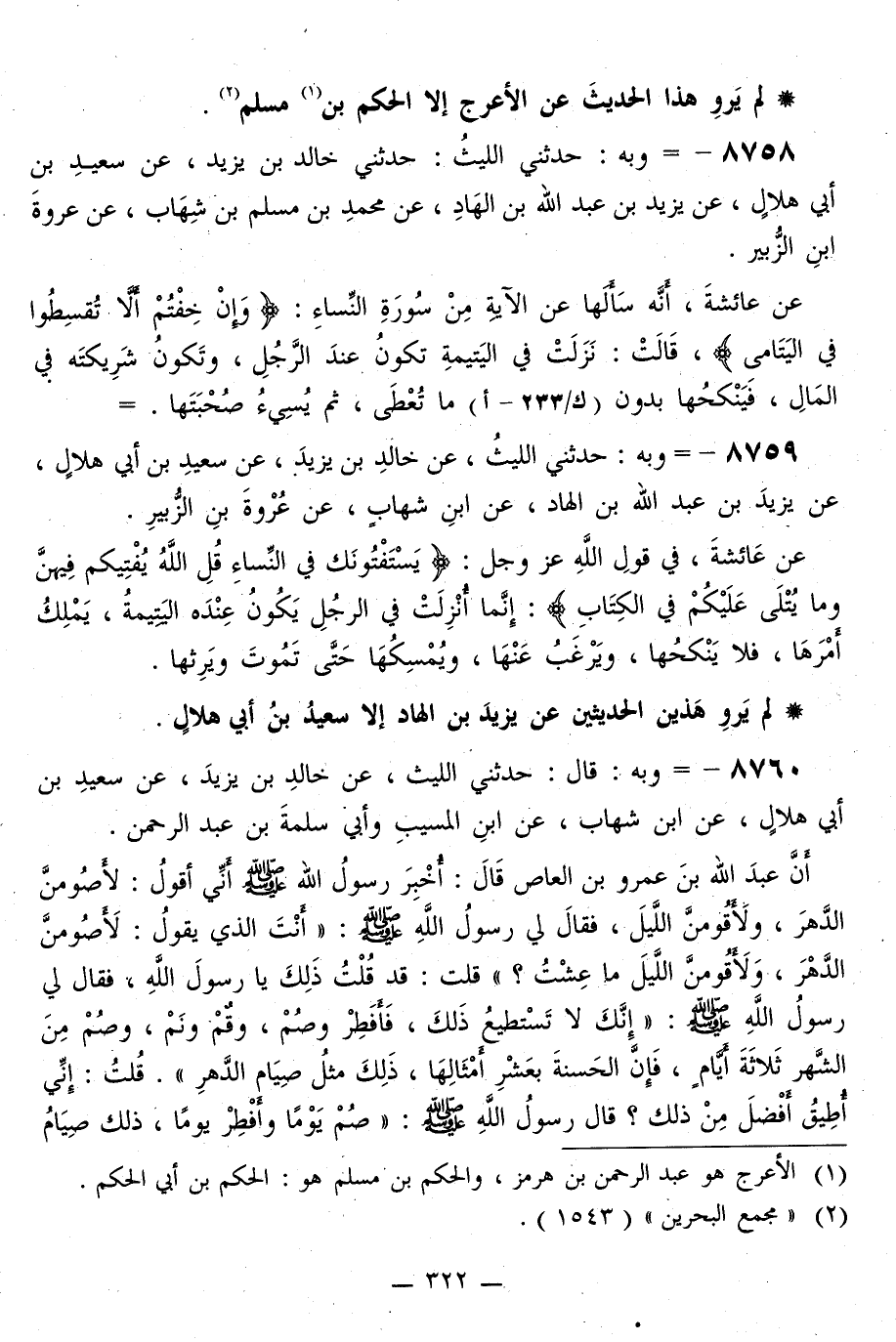 8760 - وَبِهِ: قَالَ: حَدَّثَنِي اللَّيْثُ، عَنْ خَالِدِ بْنِ يَزِيدَ، عَنْ سَعِيدِ بْنِ أَبِي هِلَالٍ، عَنِ ابْنِ شِهَابٍ، عَنِ ابْنِ الْمُسَيِّبِ، وَأَبِي سَلَمَةَ بْنِ عَبْدِ الرَّحْمَنِ، أَنَّ عَبْدَ اللَّهِ بْنَ عَمْرِو بْنِ الْعَاصِ قَالَ: أُخْبِرَ رَسُولُ اللَّهِ صَلَّى اللهُ عَلَيْهِ وَسَلَّمَ أَنِّي أَقُولُ: لَأَصُومَنَّ الدَّهْرَ، وَلَأَقُومَنَّ اللَّيْلَ، فَقَالَ لِي رَسُولُ اللَّهِ صَلَّى اللهُ عَلَيْهِ وَسَلَّمَ: «§أَنْتَ الَّذِي يَقُولُ لَأَصُومَنَّ الدَّهْرَ وَلَأَقُومَنَّ اللَّيْلَ مَا عِشْتُ؟» ، قُلْتُ: قَدْ قُلْتُ ذَلِكَ يَا رَسُولَ اللَّهِ، فَقَالَ لِي رَسُولُ اللَّهِ صَلَّى اللهُ عَلَيْهِ وَسَلَّمَ: «إِنَّكَ لَا تَسْتَطِيعُ ذَلِكَ، فَأَفْطِرْ وَصُمْ، وَقُمْ وَنَمْ، وَصُمْ مِنَ الشَّهْرِ ثَلَاثَةَ أَيَّامٍ، فَإِنَّ الْحَسَنَةَ بِعَشْرِ أَمْثَالِهَا، ذَلِكَ مِثْلُ صِيَامِ الدَّهْرِ» ، قُلْتُ: إِنِّي أُطِيقُ أَفْضَلَ مِنْ ذَلِكَ؟ قَالَ رَسُولُ اللَّهِ صَلَّى اللهُ عَلَيْهِ وَسَلَّمَ: «صُمْ يَوْمًا، وَأَفْطِرْ يَوْمًا ذَلِكَ صِيَامُ -[323]- دَاوُدَ صَلَّى اللهُ عَلَيْهِ وَسَلَّمَ، وَهُوَ أَعْدِلُ الصِّيَامِ» ، قُلْتُ: يَا رَسُولَ اللَّهِ، إِنِّي أُطِيقُ أَفْضَلَ مِنْ ذَلِكَ؟ قَالَ: «لَا أَفْضَلَ مِنْ ذَلِكَ»