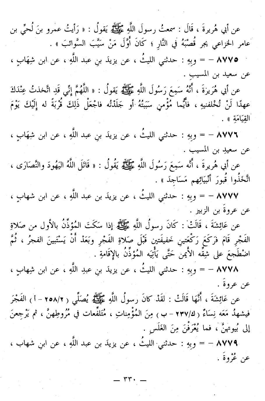 8776 - وَبِهِ: حَدَّثَنِي اللَّيْثُ، عَنْ يَزِيدَ بْنِ عَبْدِ اللَّهِ، عَنِ ابْنِ شِهَابٍ، عَنْ سَعِيدِ بْنِ الْمُسَيِّبِ، عَنْ أَبِي هُرَيْرَةَ، أَنَّهُ سَمِعَ رَسُولَ اللَّهِ صَلَّى اللهُ عَلَيْهِ وَسَلَّمَ يَقُولُ: «§قَاتَلَ اللَّهُ الْيَهُودَ وَالنَّصَارَى، اتَّخَذُوا قُبُورَ أَنْبِيَائِهِمْ مَسَاجِدَ»
