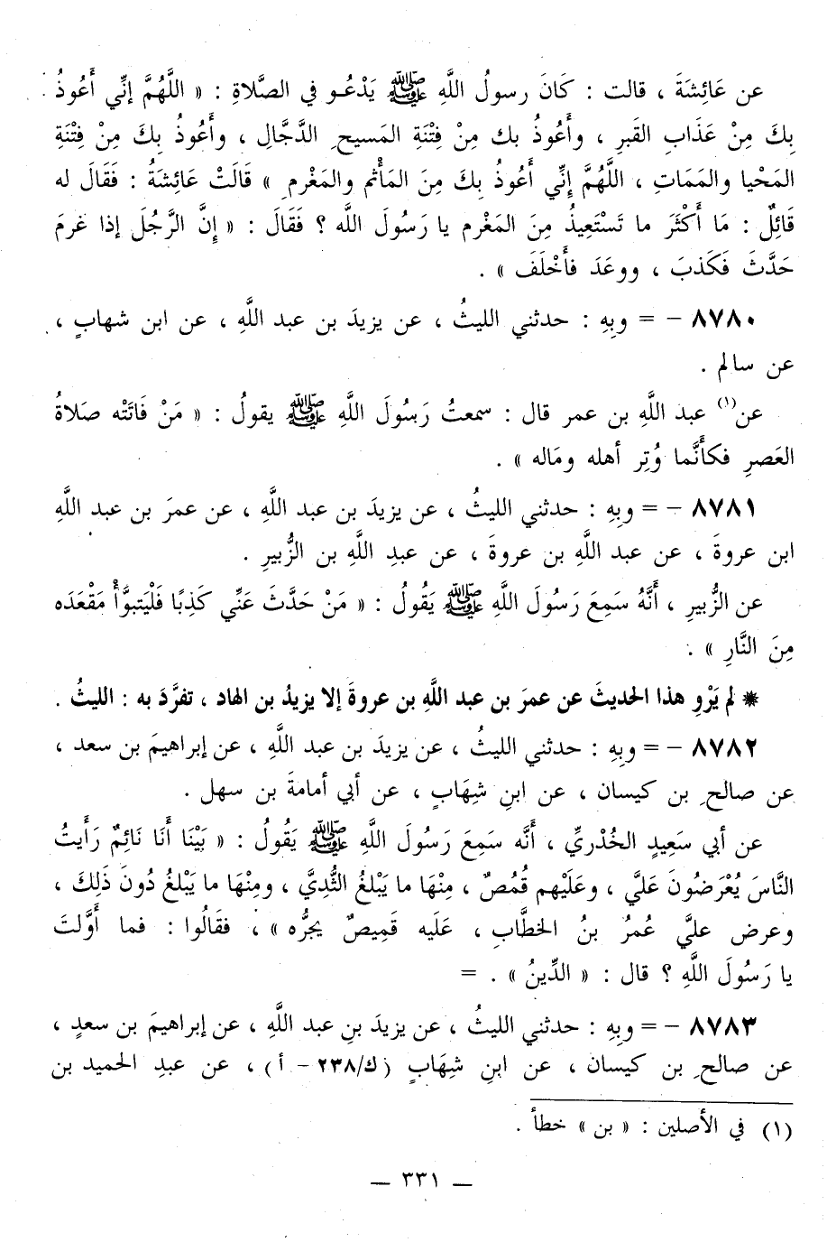 8781 - وَبِهِ: حَدَّثَنِي اللَّيْثُ، عَنْ يَزِيدَ بْنِ عَبْدِ اللَّهِ، عَنْ عُمَرَ بْنِ عَبْدِ اللَّهِ بْنِ عُرْوَةَ، عَنْ عَبْدِ اللَّهِ بْنِ عُرْوَةَ، عَنْ عَبْدِ اللَّهِ بْنِ الزُّبَيْرِ، عَنِ الزُّبَيْرِ، أَنَّهُ سَمِعَ رَسُولَ اللَّهِ صَلَّى اللهُ عَلَيْهِ وَسَلَّمَ يَقُولُ: «§مَنْ حَدَّثَ عَنِّي كَذِبًا فَلْيَتَبَوَّأْ مَقْعَدَهُ مِنَ النَّارِ»