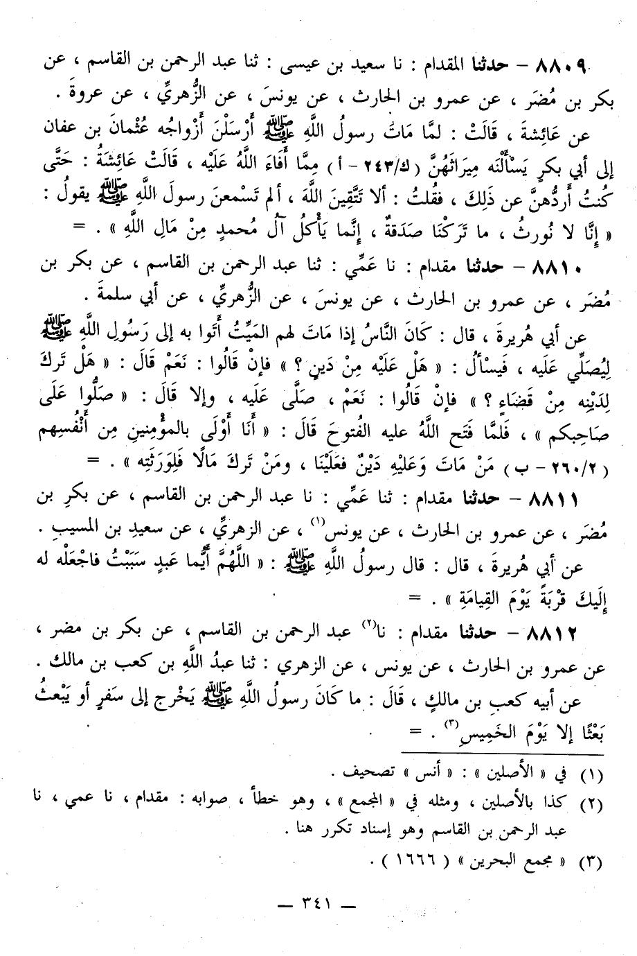 8809 - حَدَّثَنَا الْمِقْدَامٌ، نا سَعِيدُ بْنُ عِيسَى، ثَنَا عَبْدُ الرَّحْمَنِ بْنُ الْقَاسِمِ، عَنْ بَكْرِ بْنِ مُضَرَ، عَنْ عَمْرِو بْنِ الْحَارِثِ، عَنْ يُونُسَ، عَنِ الزُّهْرِيِّ، عَنْ عُرْوَةَ، عَنْ عَائِشَةَ، قَالَتْ: لَمَّا مَاتَ رَسُولُ اللَّهِ صَلَّى اللهُ عَلَيْهِ وَسَلَّمَ أَرْسَلْنَ أَزْوَاجُهُ عُثْمَانَ بْنَ عَفَّانَ إِلَى أَبِي بَكْرٍ يَسْأَلْنَهُ مِيرَاثَهَنَّ مِمَّا أَفَاءَ اللَّهُ عَلَيْهِ، قَالَتْ عَائِشَةُ: حَتَّى كُنْتُ أَرُدُّهُنَّ عَنْ ذَلِكَ، فَقُلْتُ: أَلَا تَتَّقِينَ اللَّهَ، أَلَمْ تَسْمَعْنَ رَسُولَ اللَّهِ صَلَّى اللهُ عَلَيْهِ وَسَلَّمَ يَقُولُ: «§إِنَّا لَا نُوَرَّثُ، مَا تَرَكْنَا صَدَقَةٌ، إِنَّمَا يَأْكُلُ آلُ مُحَمَّدٍ مِنْ مَالِ اللَّهِ»