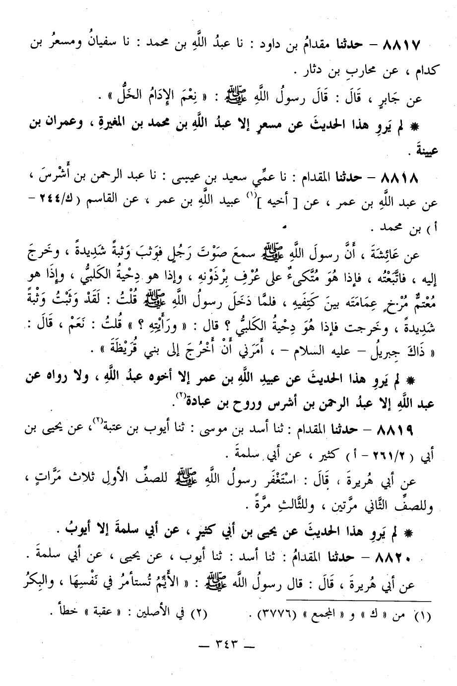 8818 - حَدَّثَنَا الْمِقْدَامُ، نا عَمِّي سَعِيدُ بْنُ عِيسَى، نا عَبْدُ الرَّحْمَنِ بْنُ أَشْرَسَ، عَنْ عَبْدِ اللَّهِ بْنِ عُمَرَ، عَنْ أَخِيهِ عُبَيْدِ اللَّهِ بْنِ عُمَرَ، عَنِ الْقَاسِمِ بْنِ مُحَمَّدٍ، عَنْ عَائِشَةَ، أَنَّ رَسُولَ اللَّهِ صَلَّى اللهُ عَلَيْهِ وَسَلَّمَ سَمِعَ صَوْتَ رِجْلٍ، فَوَثَبَ وَثْبَةً شَدِيدَةً وَخَرَجَ إِلَيْهِ، فَاتَّبَعَتْهُ، فَإِذَا هُوَ مُتَّكِئٌ عَلَى عُرْفِ بِرْذَوْنِهِ، وَإِذَا هُوَ دِحْيَةُ الْكَلْبِيُّ، وَإِذَا هُوَ مُعْتَمٌّ مُرْخٍ عِمَامَتَهُ بَيْنَ كَتِفَيْهِ، فَلَمَّا دَخَلَ رَسُولُ اللَّهِ صَلَّى اللهُ عَلَيْهِ وَسَلَّمَ، قُلْتُ: لَقَدْ وَثَبْتَ وَثْبَةً شَدِيدَةً، وَخَرَجْتَ فَإِذَا هُوَ دِحْيَةُ الْكَلْبِيُّ؟ قَالَ: «وَرَأَيْتِهِ؟» قُلْتُ: نَعَمْ قَالَ: «§ذَاكَ جِبْرِيلُ عَلَيْهِ السَّلَامُ، أَمَرَنِي أَنْ أَخْرُجَ إِلَى بَنِي قُرَيْظَةَ»