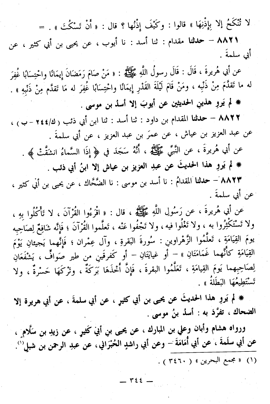 8823 - حَدَّثَنَا الْمِقْدَامُ، نا أَسَدُ بْنُ مُوسَى، نا الضَّحَّاكُ، عَنْ يَحْيَى بْنِ أَبِي كَثِيرٍ، عَنْ أَبِي سَلَمَةَ، عَنْ أَبِي هُرَيْرَةَ، عَنْ رَسُولِ اللَّهِ صَلَّى اللهُ عَلَيْهِ وَسَلَّمَ قَالَ: «§اقْرَءُوا الْقُرْآنَ، لَا تَأْكُلُوا بِهِ، وَلَا تَسْتَكْثِرُوا بِهِ، وَلَا تَغْلُوا فِيهِ، وَلَا تَجْفُوا عَنْهُ، تَعَلَّمُوا الْقُرْآنَ، فَإِنَّهُ شَافِعٌ لِصَاحِبِهِ يَوْمَ الْقِيَامَةِ، تَعَلَّمُوا الزَّهْرَاوَيْنِ: سُورَةَ الْبَقَرَةِ، وَآلِ عِمْرَانَ، فَإِنَّهُمَا يَجِيئَانِ يَوْمَ الْقِيَامَةِ كَأَنَّهُمَا غَمَامَتَانِ أَوْ غَيَايَتَانِ أَوْ كَفِرْقَيْنِ مِنْ طَيْرٍ صَوَافَّ، يَشْفَعَانِ لِصَاحِبِهِمَا يَوْمَ الْقِيَامَةِ، تَعَلَّمُوا الْبَقَرَةَ، فَإِنَّ أَخْذَهَا بَرَكَةٌ، وتَرْكَهَا حَسْرَةٌ، وَلَا تَسْتَطِيعُهَا الْبَطَلَةُ»