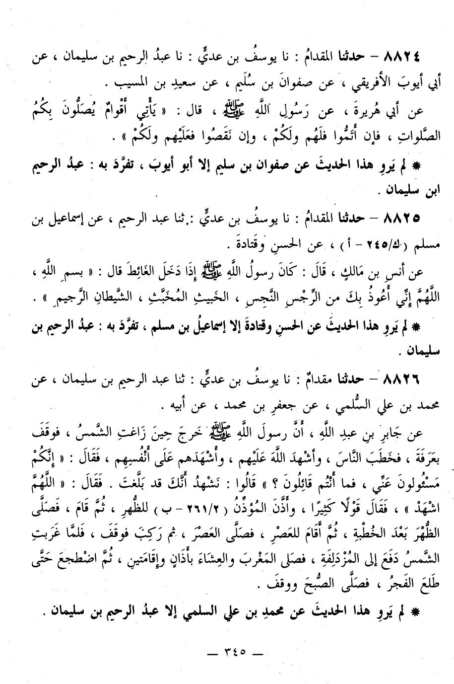 8826 - حَدَّثَنَا مِقْدَامٌ، نا يُوسُفُ بْنُ عَدِيٍّ، ثَنَا عَبْدُ الرَّحِيمِ بْنُ سُلَيْمَانَ، عَنْ مُحَمَّدِ بْنِ عَلِيٍّ السَّلَمِيِّ، عَنْ جَعْفَرِ بْنِ مُحَمَّدٍ، عَنْ أَبِيهِ، عَنْ جَابِرِ بْنِ عَبْدِ اللَّهِ، أَنَّ رَسُولَ اللَّهِ صَلَّى اللهُ عَلَيْهِ وَسَلَّمَ خَرَجَ حِينَ زَاغَتِ الشَّمْسُ، فَوَقَفَ بِعَرَفَةَ، فَخَطَبَ النَّاسَ، وَأَشْهَدَ اللَّهَ عَلَيْهِمْ، وَأَشْهَدَهُمْ عَلَى أَنْفُسِهِمْ، فَقَالَ: «§إِنَّكُمْ مَسْئُولُونَ عَنِّي، فَمَا أَنْتُمْ قَائِلُونَ؟» قَالُوا: نَشْهَدُ أَنَّكَ قَدْ بَلَّغْتَ، فَقَالَ: «اللَّهُمَّ اشْهَدْ» ، فَقَالَ قَوْلًا كَثِيرًا، وَأَذَّنَ الْمُؤَذِّنُ لِلظُّهْرِ، ثُمَّ قَامَ، فَصَلَّى الظُّهْرَ بَعْدَ الْخُطْبَةِ، ثُمَّ أَقَامَ الْعَصْرَ، فَصَلَّى الْعَصْرَ، ثُمَّ رَكِبَ، فَوَقَفَ، فَلَمَّا غَرَبَتِ الشَّمْسُ دَفَعَ إِلَى الْمُزْدَلِفَةِ، فَصَلَّى الْمَغْرِبَ وَالْعِشَاءَ بِأَذَانٍ وَإِقَامَتَيْنِ، ثُمَّ اضْطَجَعَ حَتَّى طَلَعَ الْفَجْرُ، فَصَلَّى الصُّبْحَ وَوَقَفَ «