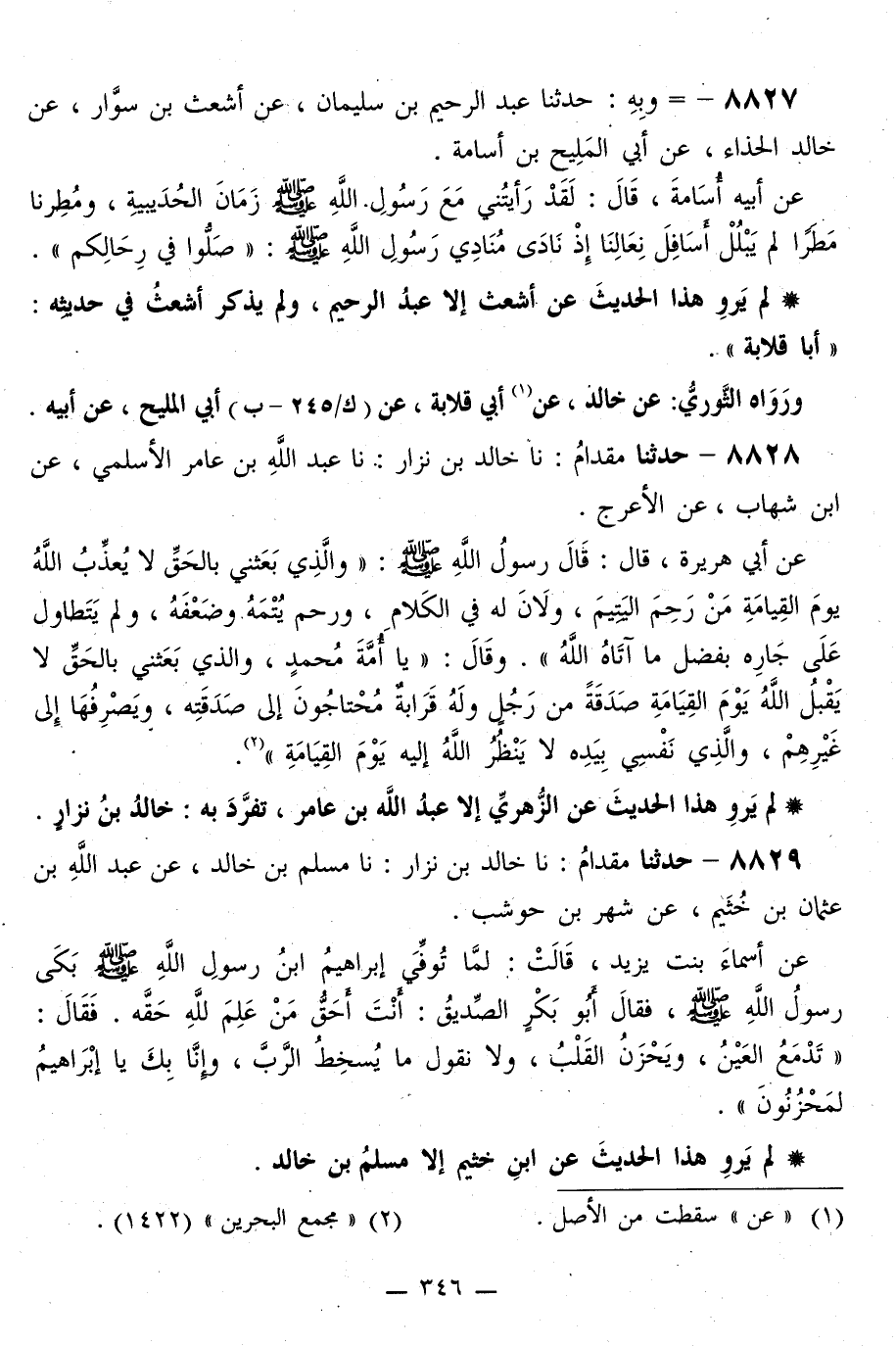 8828 - حَدَّثَنَا مِقْدَامٌ، نا خَالِدُ بْنُ نِزَارٍ، نا عَبْدُ اللَّهِ بْنِ عَامِرٍ الْأَسْلَمِيُّ، عَنِ ابْنِ شِهَابٍ، عَنِ الْأَعْرَجِ، عَنْ أَبِي هُرَيْرَةَ قَالَ: قَالَ رَسُولُ اللَّهِ صَلَّى اللهُ عَلَيْهِ وَسَلَّمَ: «§وَالَّذِي بَعَثَنِي بِالْحَقِّ لَا يُعَذِّبُ اللَّهُ يَوْمَ الْقِيَامَةِ مَنْ رَحِمَ الْيَتِيمَ، وَلَانَ لَهُ فِي الْكَلَامِ، وَرَحِمَ يُتْمَهُ وَضَعْفَهُ، وَلَمْ يَتَطَاوَلْ عَلَى جَارِهِ بِفَضْلِ مَا آتَاهُ اللَّهُ»