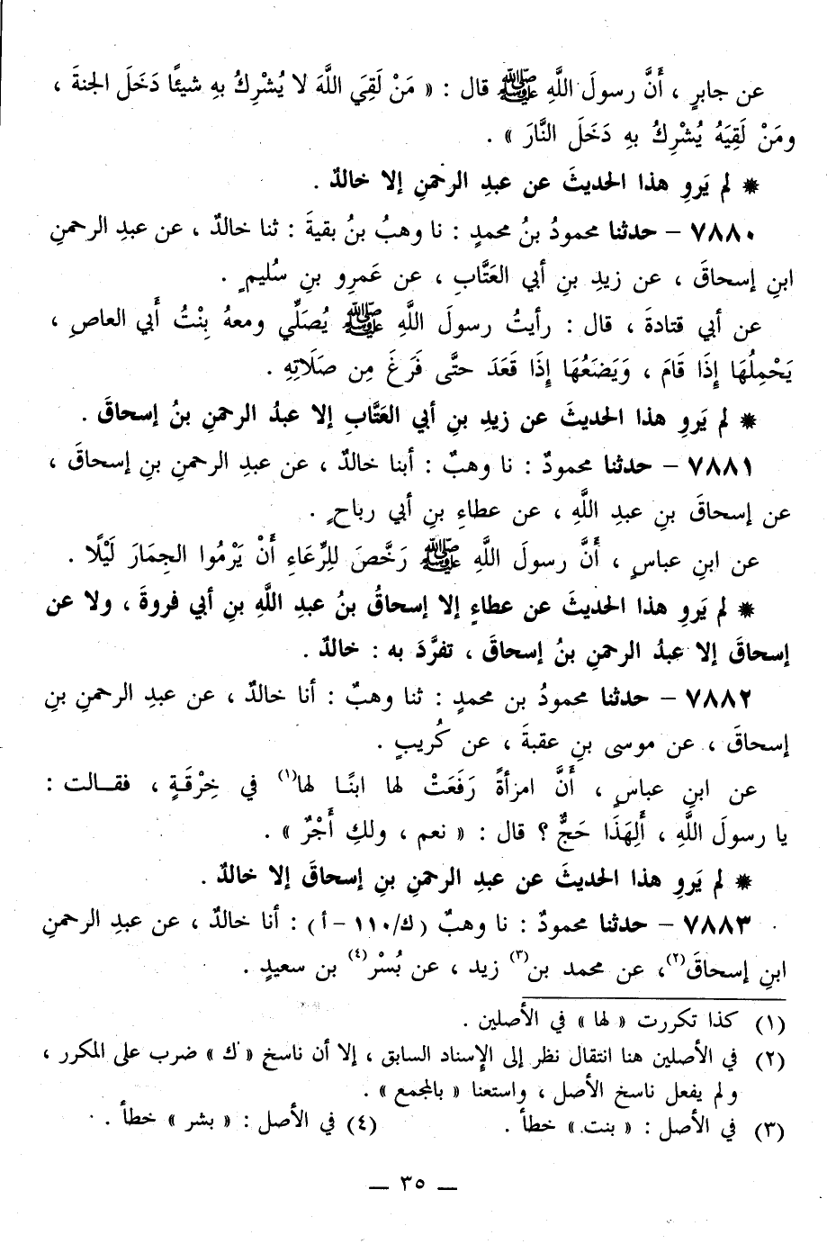 7880 - حَدَّثَنَا مَحْمُودُ بْنُ مُحَمَّدٍ، نا وَهْبُ بْنُ بَقِيَّةَ، ثَنَا خَالِدٌ، عَنْ عَبْدِ الرَّحْمَنِ بْنِ إِسْحَاقَ، عَنْ زَيْدِ بْنِ أَبِي الْعَتَّابِ، عَنْ عَمْرِو بْنِ سُلَيْمٍ، عَنْ أَبِي قَتَادَةَ قَالَ: «رَأَيْتُ رَسُولَ اللَّهِ صَلَّى اللهُ عَلَيْهِ وَسَلَّمَ §يُصَلِّي وَمَعَهُ بِنْتُ أَبِي الْعَاصِ يَحْمِلُهَا إِذَا قَامَ، وَيَضَعُهَا إِذَا قَعَدَ حَتَّى فَرَغَ مِنْ صَلَاتِهِ»