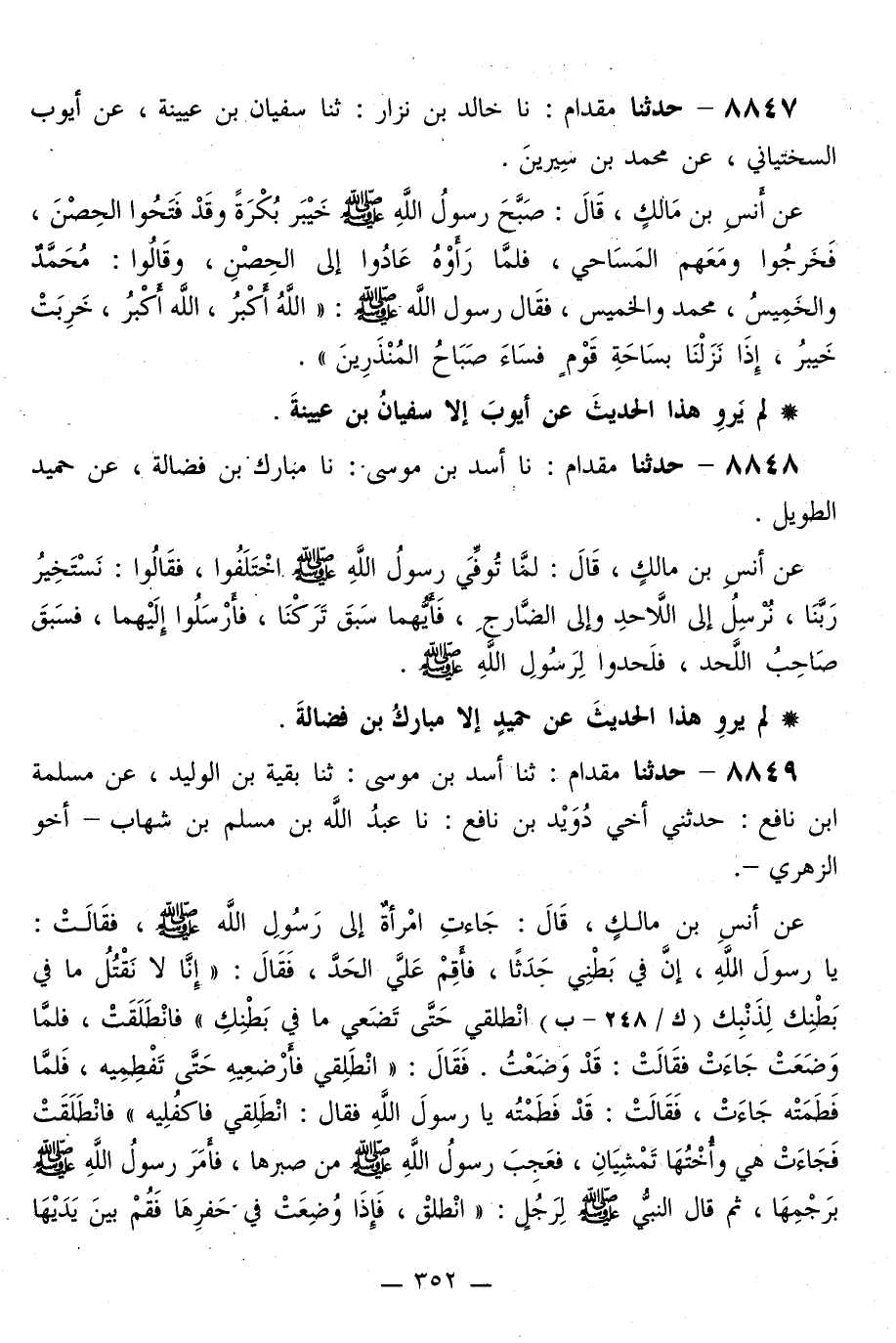 8849 - حَدَّثَنَا مِقْدَامٌ، ثَنَا أَسَدُ بْنُ مُوسَى، ثَنَا بَقِيَّةُ بْنُ الْوَلِيدِ، عَنْ مَسْلَمَةَ بْنِ نَافِعٍ، حَدَّثَنِي أَخِي دُوَيْدُ بْنُ نَافِعٍ، نا عَبْدُ اللَّهِ بْنُ مُسْلِمِ بْنِ شِهَابٍ، أَخُو الزُّهْرِيِّ، عَنْ أَنَسِ بْنِ مَالِكٍ قَالَ: جَاءَتِ امْرَأَةٌ إِلَى رَسُولِ اللَّهِ صَلَّى اللهُ عَلَيْهِ وَسَلَّمَ، فَقَالَتْ: يَا رَسُولَ اللَّهِ، إِنَّ فِي بَطْنِي حَدَثًا، فَأَقِمْ عَلَيَّ الْحَدَّ، فَقَالَ: «§إِنَّا لَا نَقْتُلُ مَا فِي بَطْنِكِ لِذَنْبِكِ انْطَلِقِي حَتَّى تَضَعِي مَا فِي بَطْنِكِ» ، فَانْطَلَقَتْ، فَلَمَّا وَضَعَتْ جَاءَتْ فَقَالَتْ: قَدْ وَضَعْتُ. فَقَالَ: «انْطَلِقِي فَأَرْضِعِيهِ حَتَّى تَفْطِمِيهِ» ، فَلَمَّا فَطَمَتْهُ جَاءَتْ فَقَالَتْ: قَدْ فَطَمْتُهُ يَا رَسُولً اللَّهِ. فَقَالَ: «انْطَلِقِي فَاكْفُلِيهِ» فَانْطَلَقَتْ فَجَاءَتْ هِيَ وَأُخْتُهَا تَمْشِيَانِ، فَعَجِبَ رَسُولُ اللَّهِ صَلَّى اللهُ عَلَيْهِ وَسَلَّمَ مِنْ صَبْرِهَا، فَأَمَرَ رَسُولُ اللَّهِ صَلَّى اللهُ عَلَيْهِ وَسَلَّمَ بِرَجْمِهَا، ثُمَّ قَالَ النَّبِيُّ صَلَّى اللهُ عَلَيْهِ وَسَلَّمَ لِرَجُلٍ: «انْطَلِقْ، فَإِذَا وَضَعْتَ فِي حَفْرِهَا فَقُمْ بَيْنَ يَدَيْهَا