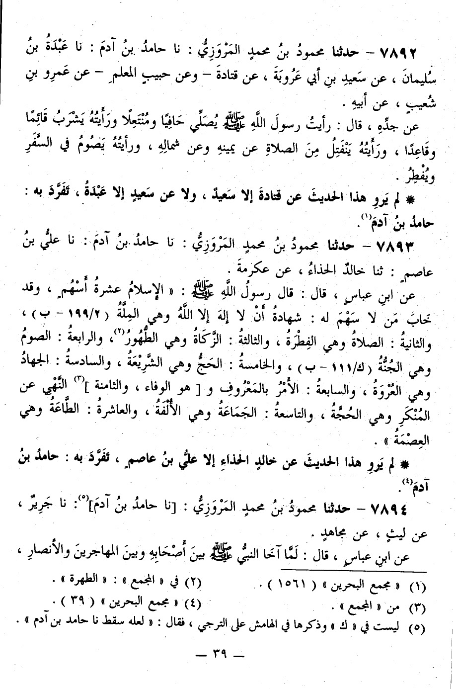 7893 - حَدَّثَنَا مَحْمُودُ بْنُ مُحَمَّدٍ الْمَرْوَزِيُّ، نا حَامِدُ بْنُ آدَمَ، نا عَلِيُّ بْنُ عَاصِمٍ، ثَنَا خَالِدٌ الْحَذَّاءُ، عَنْ عِكْرِمَةَ، عَنِ ابْنِ عَبَّاسٍ قَالَ: قَالَ رَسُولُ اللَّهِ صَلَّى اللهُ عَلَيْهِ وَسَلَّمَ: «§الْإِسْلَامُ عَشْرَةُ أَسْهُمٍ، وَقَدْ خَابَ مَنْ لَا سَهْمَ لَهُ شَهَادَةُ أَنْ لَا إِلَهَ إِلَّا اللَّهُ، وَهِيَ الْمِلَّةُ، وَالثَّانِيَةُ الصَّلَاةُ وَهِيَ الْفِطْرَةُ، وَالثَّالِثَةُ الزَّكَاةُ وَهِيَ الطَّهُورُ، وَالرَّابِعَةُ الصَّوْمُ وَهِيَ الْجَنَّةُ، وَالْخَامِسَةُ الْحَجُّ وَهِيَ الشَّرِيعَةُ، وَالسَّادِسَةُ الْجِهَادُ وَهِيَ الْعُرْوَةُ، وَالسَّابِعَةُ الْأَمْرُ بِالْمَعْرُوفِ وَهُوَ الْوَفَاءُ، وَالثَّامِنَةُ النَّهْيُ عَنِ الْمُنْكَرِ وَهِيَ الْحُجَّةُ، وَالتَّاسِعَةُ الْجَمَاعَةُ وَهِيَ الْأُلْفَةُ، وَالْعَاشِرَةُ الطَّاعَةُ وَهِيَ الْعِصْمَةُ» لَمْ يَرْوِ هَذَا الْحَدَيثَ عَنْ خَالِدٍ الْحَذَّاءِ إِلَّا عَلِيُّ بْنُ عَاصِمٍ، تَفَرَّدَ بِهِ: حَامِدُ بْنُ آدَمَ"