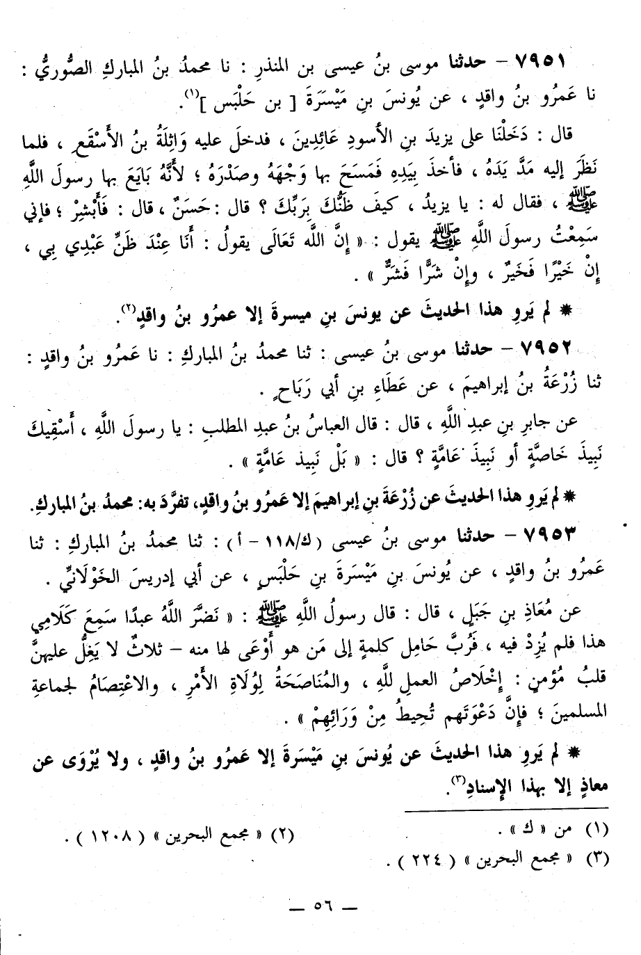 7953 - حَدَّثَنَا مُوسَى بْنُ عِيسَى، ثَنَا مُحَمَّدُ بْنُ الْمُبَارَكِ، ثَنَا عَمْرُو بْنُ وَاقِدٍ، عَنْ يُونُسَ بْنِ مَيْسَرَةَ بْنِ حَلْبَسٍ، عَنْ أَبِي إِدْرِيسَ الْخَوْلَانِيِّ، عَنْ مُعَاذِ بْنِ جَبَلٍ قَالَ: قَالَ رَسُولُ اللَّهِ صَلَّى اللهُ عَلَيْهِ وَسَلَّمَ: «§نَضَّرَ اللَّهُ عَبْدًا سَمِعَ كَلَامِي هَذَا، فَلَمْ يَزِدْ فِيهِ، فَرُبَّ حَامِلِ كَلِمَةٍ إِلَى مَنْ هُوَ أَوْعَى لَهَا مِنْهُ، ثَلَاثٌ لَا يُغِلُّ عَلَيْهِنَّ: قَلْبُ مُؤْمِنٍ، إِخْلَاصُ الْعَمَلِ لِلَّهِ، وَالْمُنَاصَحَةُ لِوُلَاةِ الْأَمْرِ، وَالِاعْتِصَامُ لِجَمَاعَةِ الْمُسْلِمِينَ، فَإِنَّ دَعْوَتَهُمْ تُحِيطُ مَنْ وَرَائِهِمْ»