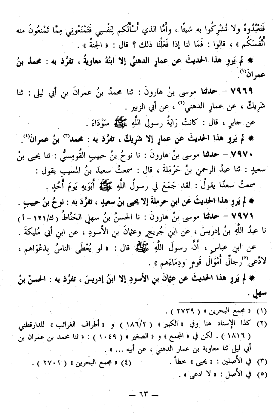 7969 - حَدَّثَنَا مُوسَى بْنُ هَارُونَ، ثَنَا مُحَمَّدُ بْنُ عِمْرَانَ بْنِ أَبِي لَيْلَى، ثَنَا شَرِيكٌ، عَنْ عَمَّارٍ الدُّهْنِيِّ، عَنْ أَبِي الزُّبَيْرِ، عَنْ جَابِرٍ قَالَ: «كَانَتْ §رَايَةُ رَسُولِ اللَّهِ صَلَّى اللهُ عَلَيْهِ وَسَلَّمَ سَوْدَاءَ»
