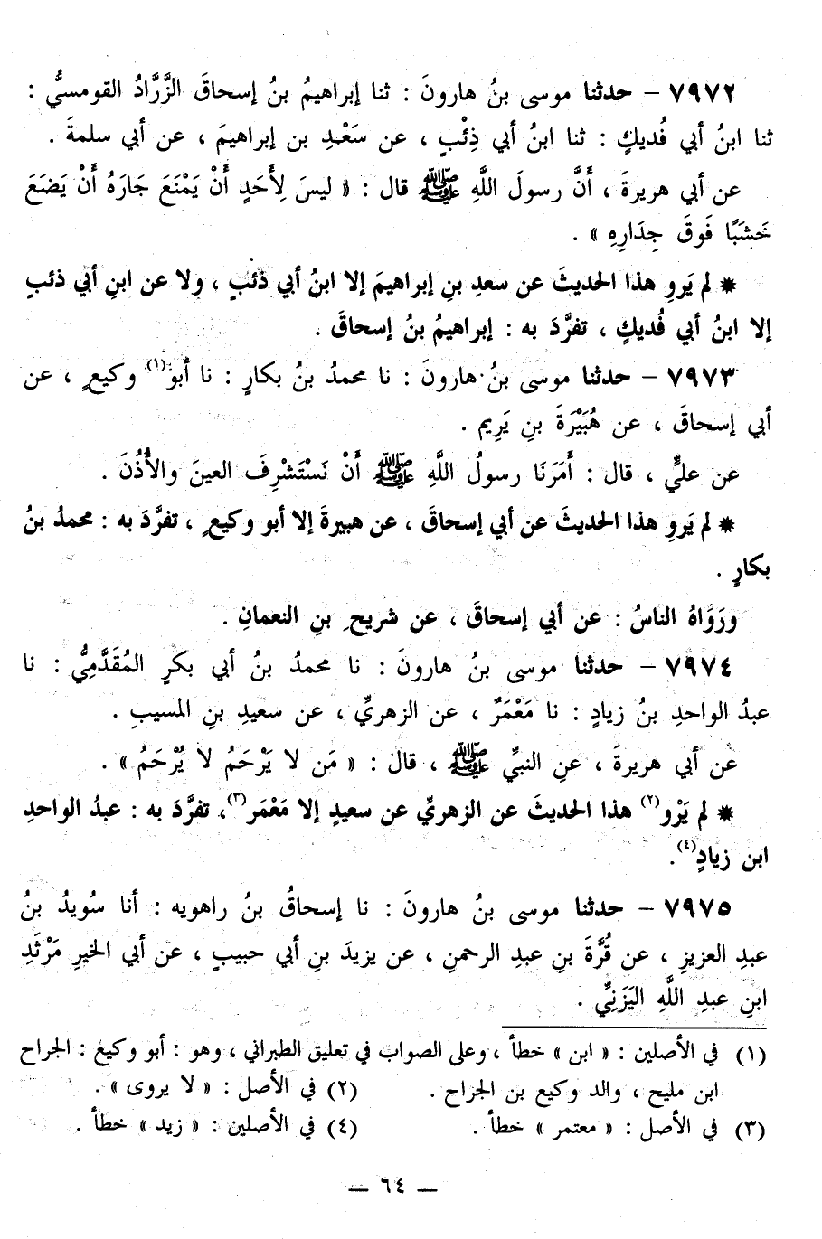 7974 - حَدَّثَنَا مُوسَى بْنُ هَارُونَ، نا مُحَمَّدُ بْنُ أَبِي بَكْرٍ الْمُقَدَّمِيُّ، نا عَبْدُ الْوَاحِدِ بْنُ زِيَادٍ، نا مَعْمَرٌ، عَنِ الزُّهْرِيِّ، عَنْ سَعِيدِ بْنِ الْمُسَيِّبِ، عَنْ أَبِي هُرَيْرَةَ، عَنِ النَّبِيِّ صَلَّى اللهُ عَلَيْهِ وَسَلَّمَ قَالَ: «§مَنْ لَا يَرْحَمُ لَا يُرْحَمُ»