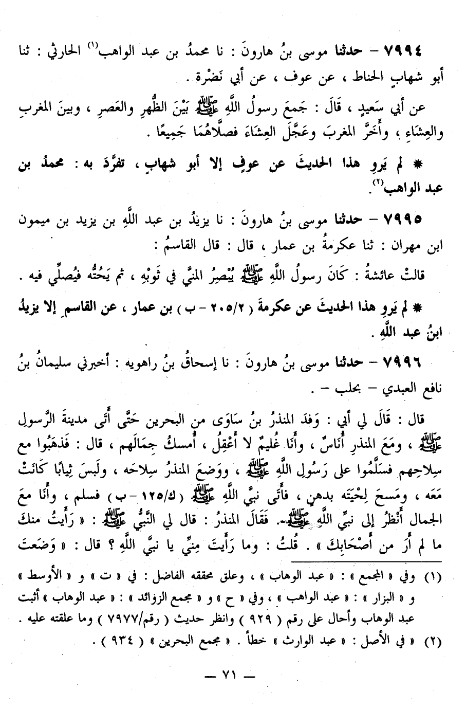 7994 - حَدَّثَنَا مُوسَى بْنُ هَارُونَ، نا مُحَمَّدُ بْنُ عَبْدِ الْوَاهِبِ الْحَارِثِيُّ، ثَنَا أَبُو شِهَابٍ الْحَنَّاطُ، عَنْ عَوْفٍ، عَنْ أَبِي نَضْرَةَ، عَنْ أَبِي سَعِيدٍ قَالَ: «§جَمَعَ رَسُولُ اللَّهِ صَلَّى اللهُ عَلَيْهِ وَسَلَّمَ بَيْنَ الظُّهْرِ وَالْعَصْرِ، وَبَيْنَ الْمَغْرِبِ وَالْعِشَاءِ، وَأَخَّرَ الْمَغْرِبَ، وَعَجَّلَ الْعِشَاءَ فَصَلَّاهُمَا جَمِيعًا»