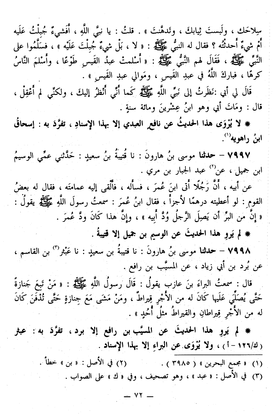 7998 - حَدَّثَنَا مُوسَى بْنُ هَارُونَ، نا قُتَيْبَةُ بْنُ سَعِيدٍ، نا عَبْثَرُ بْنُ الْقَاسِمِ، عَنْ بُرْدِ بْنِ أَبِي زِيَادٍ، عَنِ الْمُسَيِّبِ بْنِ رَافِعٍ قَالَ: سَمِعْتُ الْبَرَاءَ بْنَ عَازِبٍ، يَقُولُ: قَالَ رَسُولُ اللَّهِ صَلَّى اللهُ عَلَيْهِ وَسَلَّمَ: «§مَنِ تَبِعَ جَنَازَةً حَتَّى يُصَلِّيَ عَلَيْهَا كَانَ لَهُ مِنَ الْأَجْرِ قِيرَاطٌ، وَمَنْ مَشَى مَعَ جَنَازَةٍ حَتَّى تُدْفَنَ كَانَ لَهُ مِنَ الْأَجْرِ قِيرَاطَانِ، وَالْقِيرَاطُ مِثْلُ أُحُدٍ»