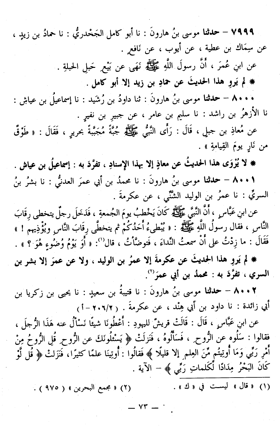 8000 - حَدَّثَنَا مُوسَى بْنُ هَارُونَ، ثَنَا دَاوُدُ بْنُ رُشَيْدٍ، نا إِسْمَاعِيلُ بْنُ عَيَّاشٍ، نا الْأَزْهَرُ بْنُ رَاشِدٍ، نا سُلَيْمُ بْنُ عَامِرٍ، عَنْ جُبَيْرِ بْنِ نُفَيْرٍ، عَنْ مُعَاذِ بْنِ جَبَلٍ قَالَ: رَأَى النَّبِيُّ صَلَّى اللهُ عَلَيْهِ وَسَلَّمَ جُبَّةً مُجَبَّبَةُ بِحَرِيرٍ، فَقَالَ: «§طَوْقٌ مِنْ نَارٍ يَوْمَ الْقِيَامَةِ»