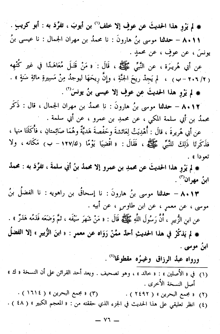 8011 - حَدَّثَنَا مُوسَى بْنُ هَارُونَ، نا مُحَمَّدُ بْنُ مِهْرَانَ الْجَمَّالُ، نا عِيسَى بْنُ يُونُسَ، عَنْ عَوْفٍ، عَنْ مُحَمَّدٍ، عَنْ أَبِي هُرَيْرَةَ، عَنِ النَّبِيِّ صَلَّى اللهُ عَلَيْهِ وَسَلَّمَ قَالَ: «§مَنْ قَتَلَ مُعَاهَدًا فِي غَيْرِ كُنْهِهِ، لَمْ يَجِدْ رِيحَ الْجَنَّةِ، وَإِنَّ رِيحَهَا لَيُوجَدُ مِنْ مَسِيرَةِ مِائَةِ سَنَةٍ»